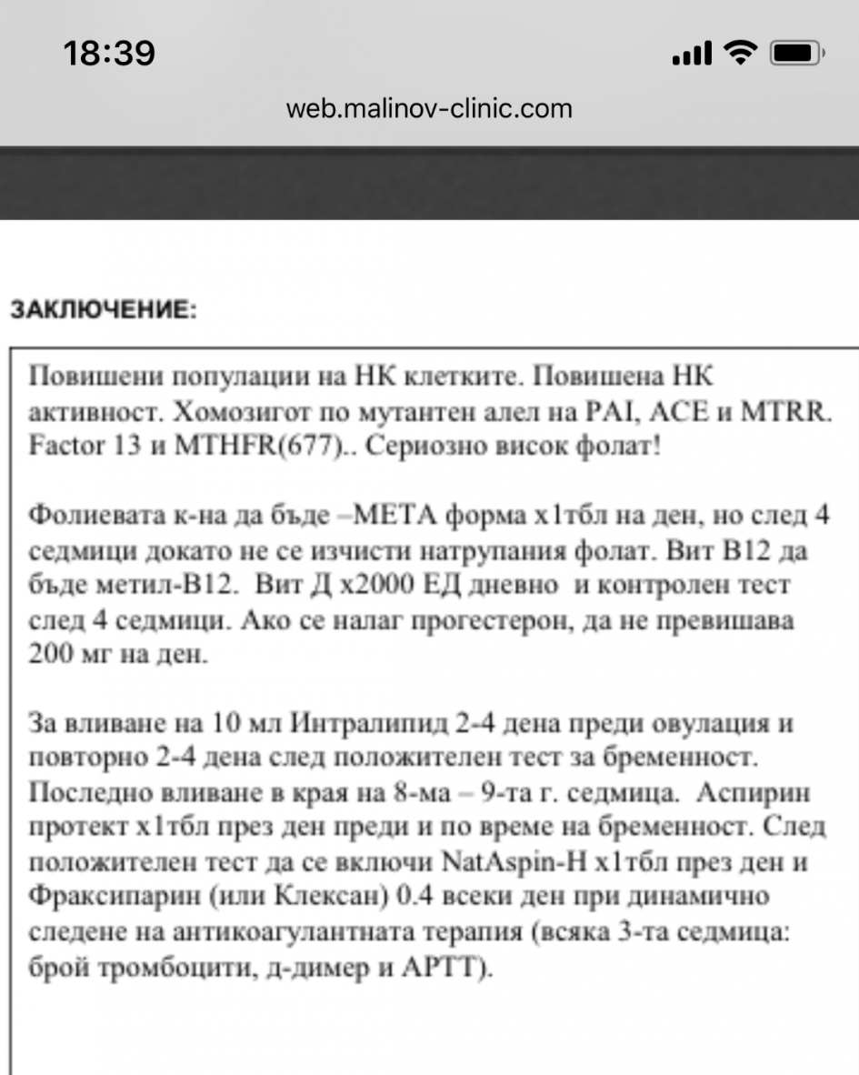 Ами аз я отрих сама тромбофилията в 21 седмица нищо притеснително не са ми казвали лекари.Просто една позната ми спомена и аз отидох да се тествам.С хомозиготен генотип 4G/4g  (Pai ) съм. Реших да ги пусна тези също на своя глава да видя как са.