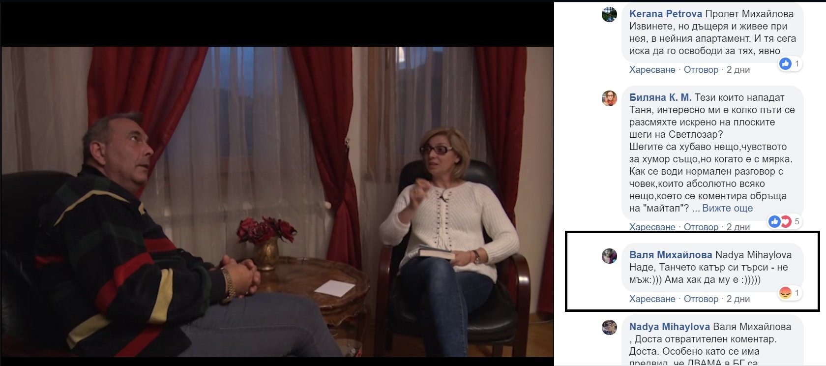 Приятелките на Лисун са същите като него - простовати, със самочувствие и злобни. Начело с Валя Михайлова, пишат по 100 коментара в негова защита, като си отговарят една на друга, тагват се, но лъжат, че са просто зрителки. А това за катъра и на него лично му го беше писала под ония пост.