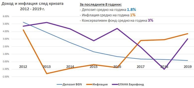 За да получите представа за реалната доходност от фондовете ни в последните години (трябва да предупредим, че доходността в миналото не е обещание за бъдещето и че когато прогнозираме, работим с консервативни прогнози),  ето вижте сравнение за последните години след голямата криза, какви са били доходите от депозит и консервативен фонд в сравнение с инфлацията: