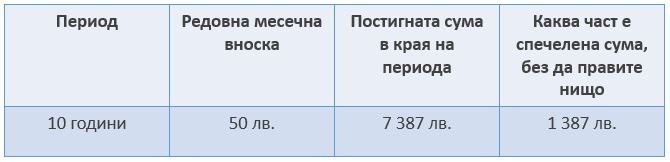 При нас можете да спестявате чрез спестовен план по 50 лв. всеки месец с автоматични вноски. Или дори без спестовен план, можете са си поръчате в банката директен дебит всеки месец за който и да било фонд, за да може да не се занимавате и парите да се отделят, преди да започнете да ги харчите.