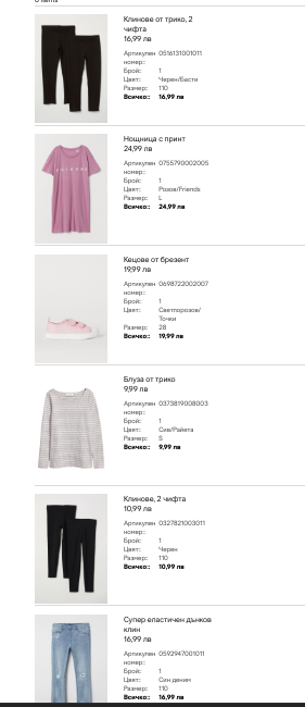 Пуснах една поръчка снощи: клинове тънки и дебели за детето, че цената беше много добра, едни "скъсани" дънки за детето...да е като мама, една трикотажна блузка за мен за 10 лева да, че не съм пас, гуменки за детето се бяха появили един чифт, дано не са дефектни и трикотажна нощница за подарък на майка ми.