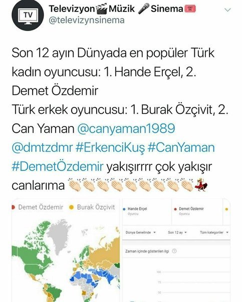 През последните 12 месеца най-популярните турски актриси са Ханде Ерчел и Демет Йоздемир и най-популярните турски актьори Бурак Йозчивид и Джан Яман 👏👏👏
