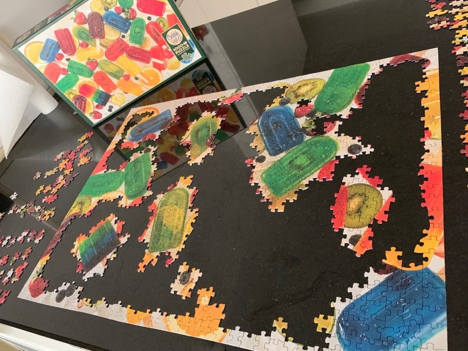 Ето наредените сладоледи, 1000 части, нестандартни, Cobble Hill (харесвам марката), сниман на лампа и накриво, но иначе се отразяваха светлини, щях да го снимам на дневна, но то тук все мрачно и вали: