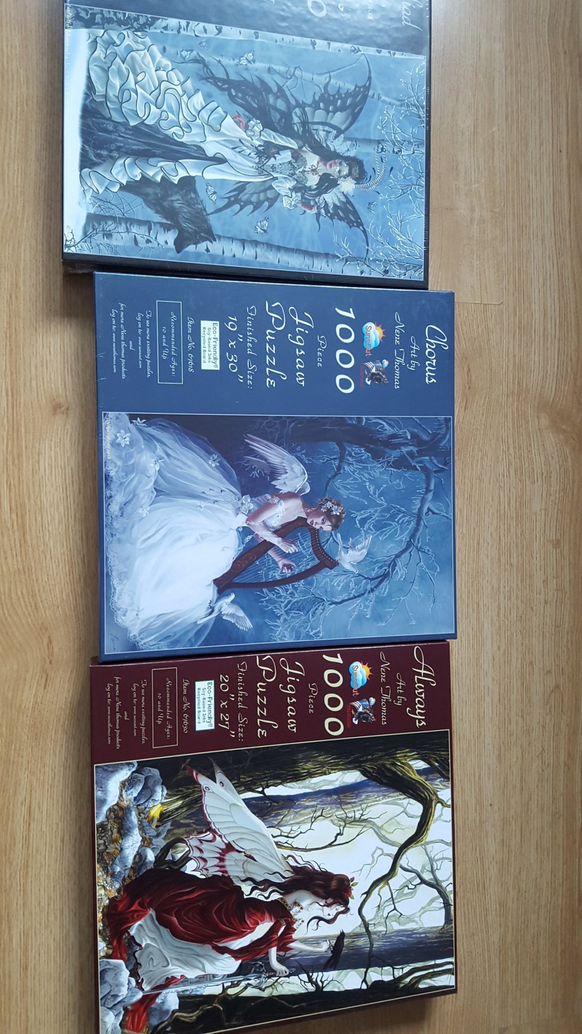 Иванита, страхотни са ти новите попълнения , на любимия ми Nene Thomas SunsOut. Последния пъзел-дамата с червена рокля и гарвана съм харесала за подарък , и следя за намаление в jigsaw puzzles.co uk за да го поръчам. Ако не е проблем би ли споделила от къде са?