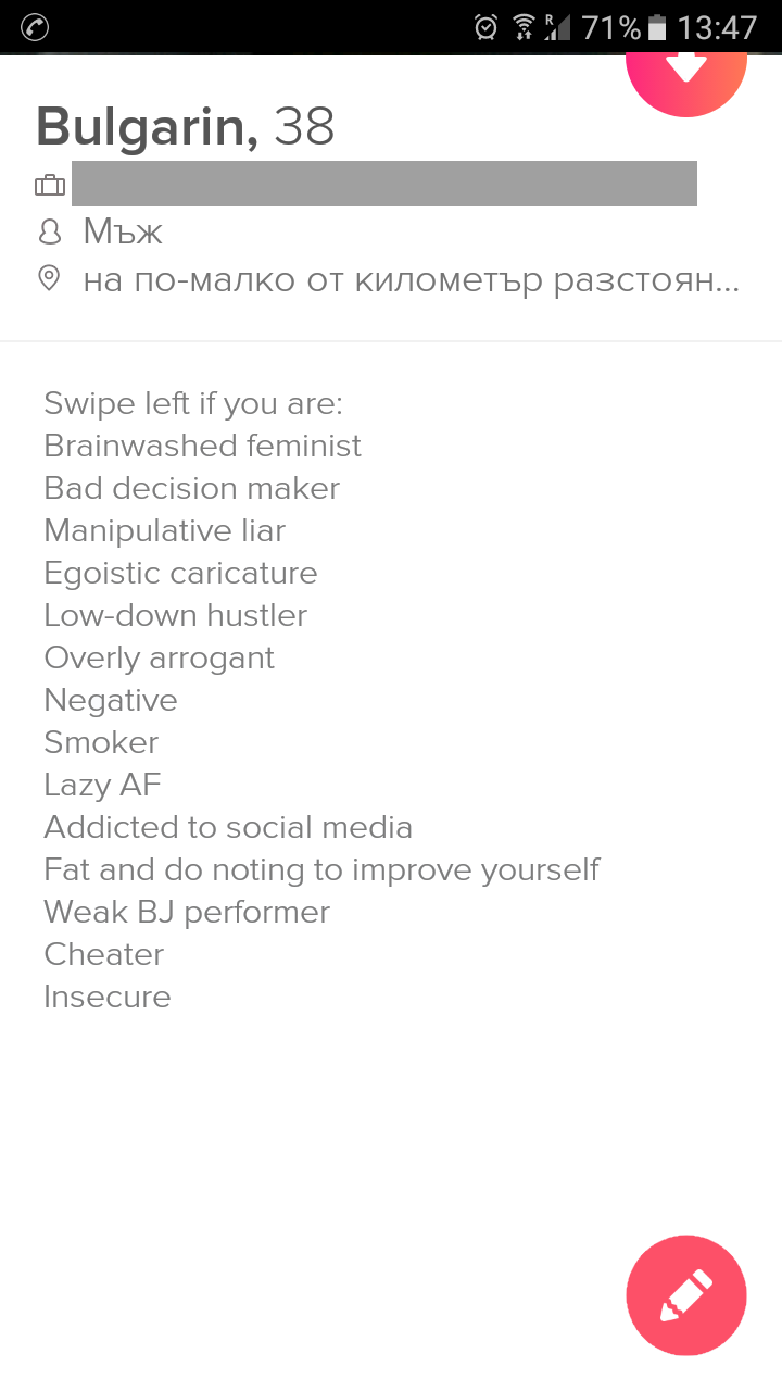 Само не разбрах - трябва ли мъжът да има някакво описание в тиндър или да си запази приказките за чата/срещата 🙄