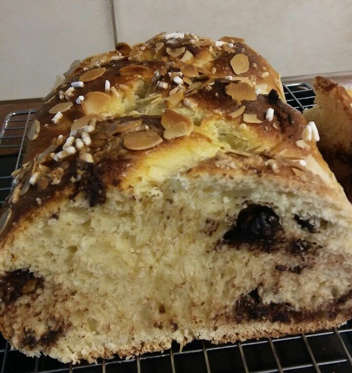 Днес направих тази козуначена плитка с шоколадов чипс. Рецептата е от едно италианско списание, само, че вместо мая я направих с квас мадре. Получи се супер пухкав козунак.