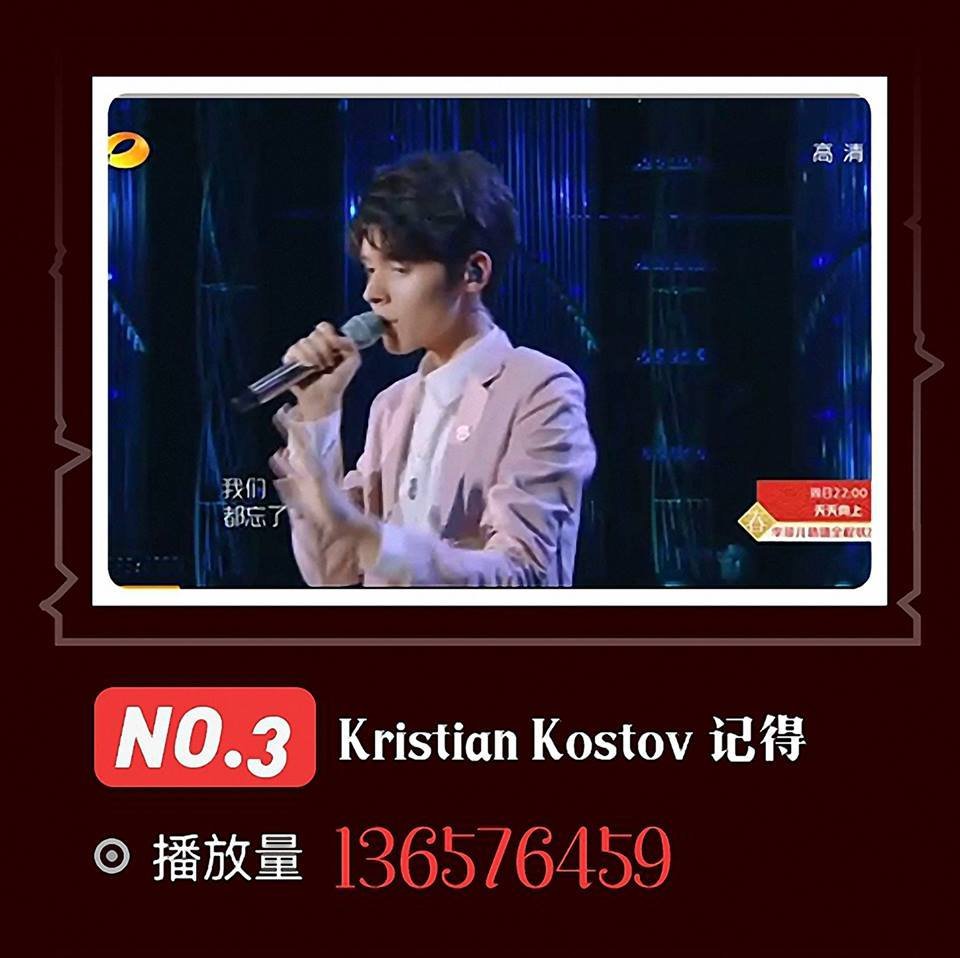 Днес излезе официалната статистика на 歌手 Singer 2019. Kristian Kostov е сред най-гледаните участници този сезон. Неговото изпълнение на китайската песен Remember (记得) се класира на трето място от всички изпълнения с над 136 милиона гледания 💪