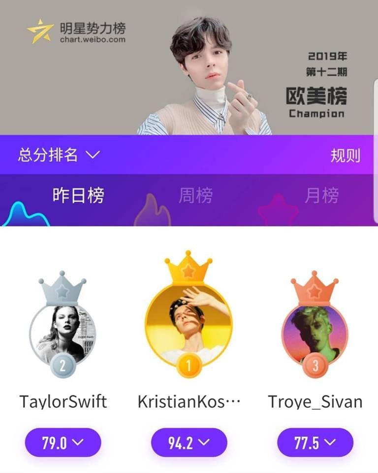 🔥🔥🔥 Вече НОМЕР 1 в Китай! Kristian Kostov е по-популярен от Taylor Swift and Troye Sivan в класацията на европейските и американските звезди във Weibo China. Поздравления! Какво по-добро начало на неделния ден