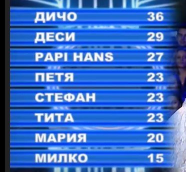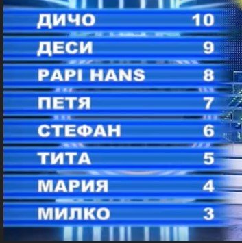 Дичо - 3, Петя - 4, Тита - 5, Мария - 6, Константин - 7, Милко - 8, Деси - 9, Стефан - 10