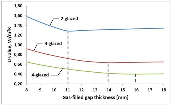 it may be stated that using gas-filled gaps that are too narrow contributes to an increase in the heat losses through glazing, which is visible especially in the case of triple-glazed and quadruple-glazed units. In such units using gaps smaller than 12 mm leads to significant deterioration of the thermal properties of the partition.