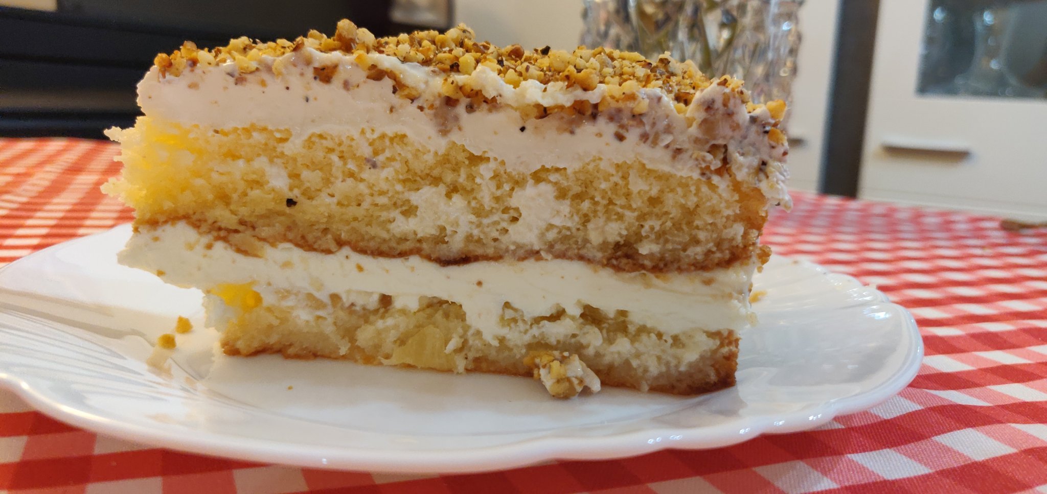 Домашна тортичка с пандишпанов блат, ананас (в/у долния блат, той затова стана видимо по-малък) и крем с кисело мляко, нещо като малко по-високомаслено кисело мляко Wink и нещо като заквасена сметана. Отгоре поръсих орехи, но не ми се правеха повече, за д аоблепя и отстрани, а само колкото останаха сложих. Съвсем за домашна консумация , затова.