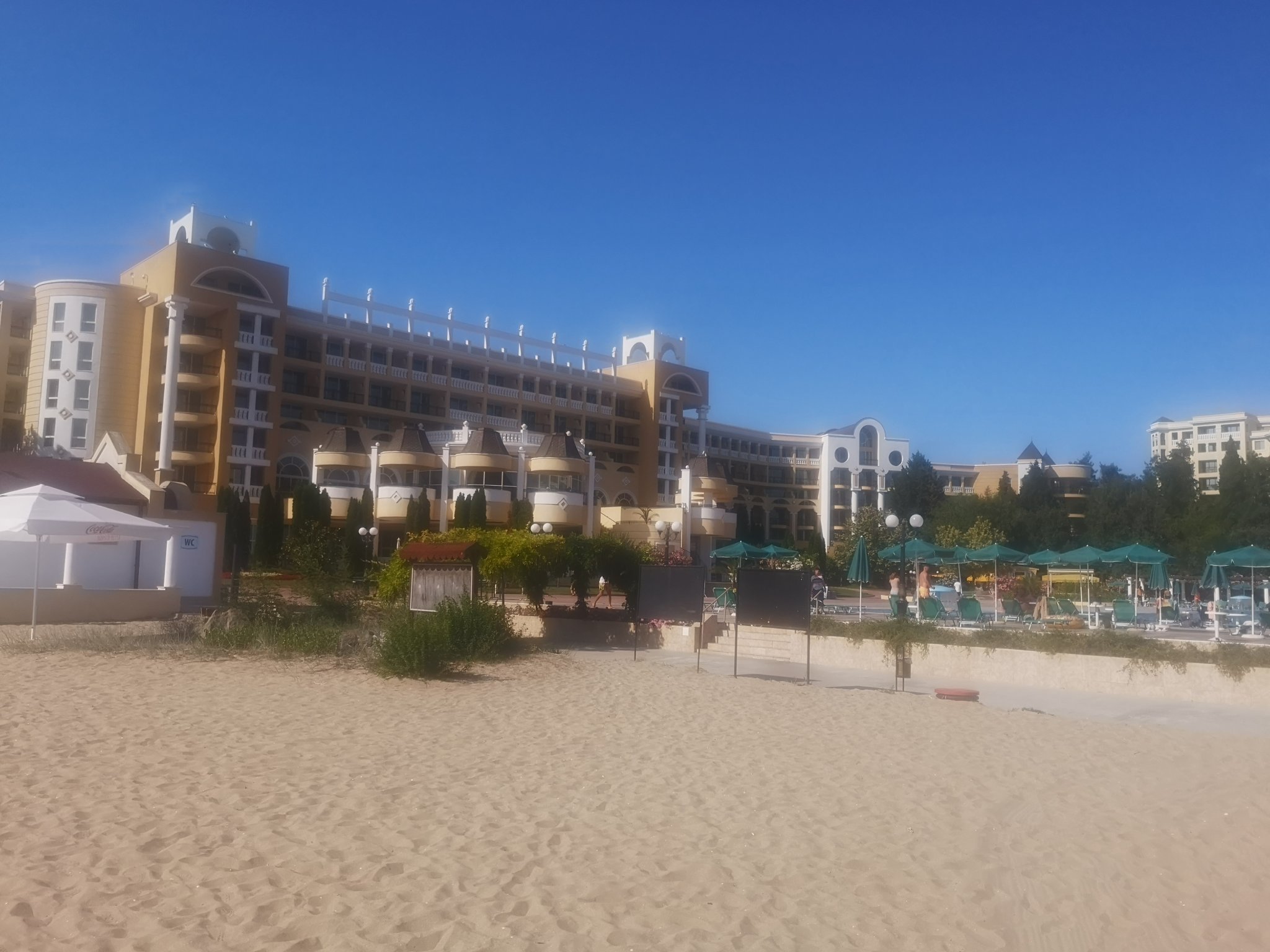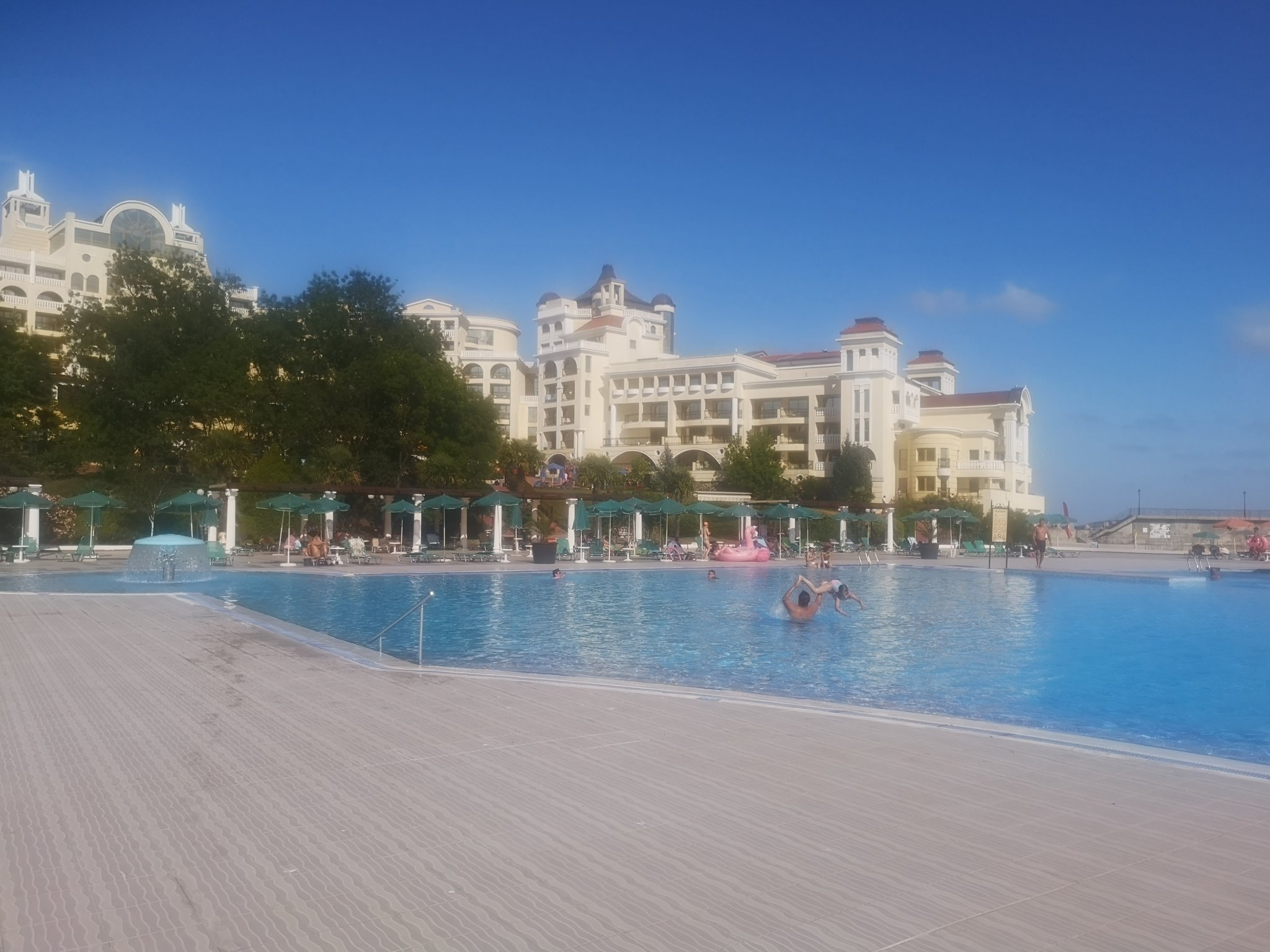 Фаталина, комплексът е огромен, много е зелено, релакс басейна работи, барът на него не. На плажа винаги има места. Днес морето е леко бурно с жълт флаг. Комплексът ми харесва, храната е добра, персоналът е любезен, независимо, че нашата вила е съвсем близо до ресторанта и аква парка ходенето е доста, комплексът е на стръмен терен в борова гора  има вили, които са доста нависоко и се препотваш докато издрапаш по стълбите. 😀