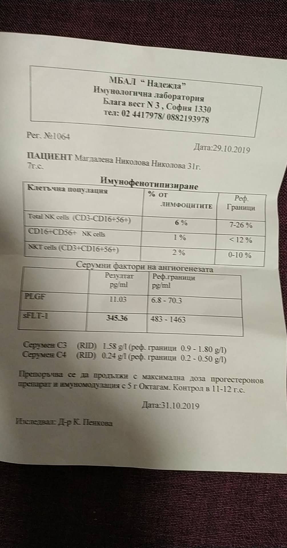 Резултатите от генетичните изследвания показват различни мутации, включително тромбофилни мутации като 4G/5G за PAI, I/D (ACE), 677C > T и други. Тези мутации са свързани с повишен риск от спонтанни аборти и други проблеми по време на бременност. За да се контролира рискът и да се поддържа здравето по време на бременността, предписани са лекарства като фракциониране и витамини като B12 и фолат.