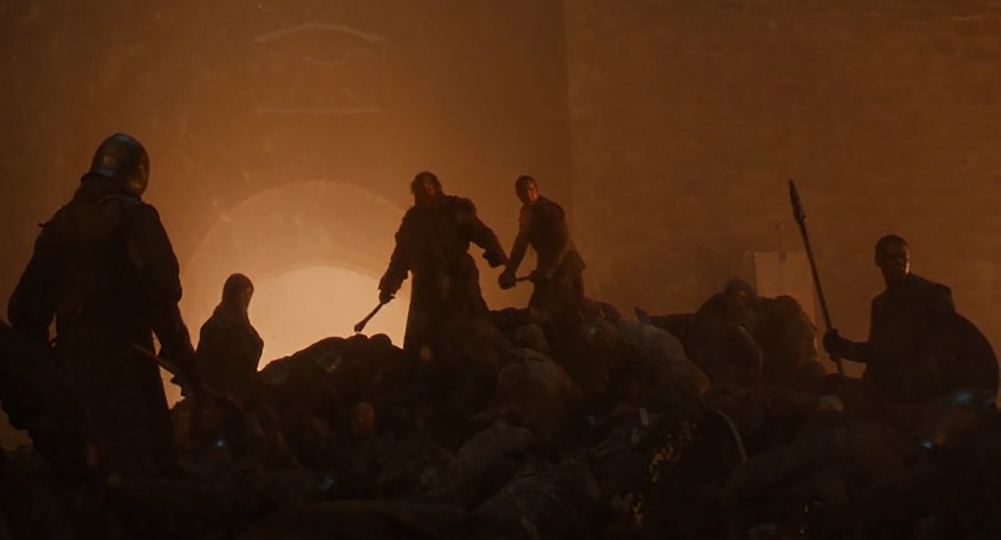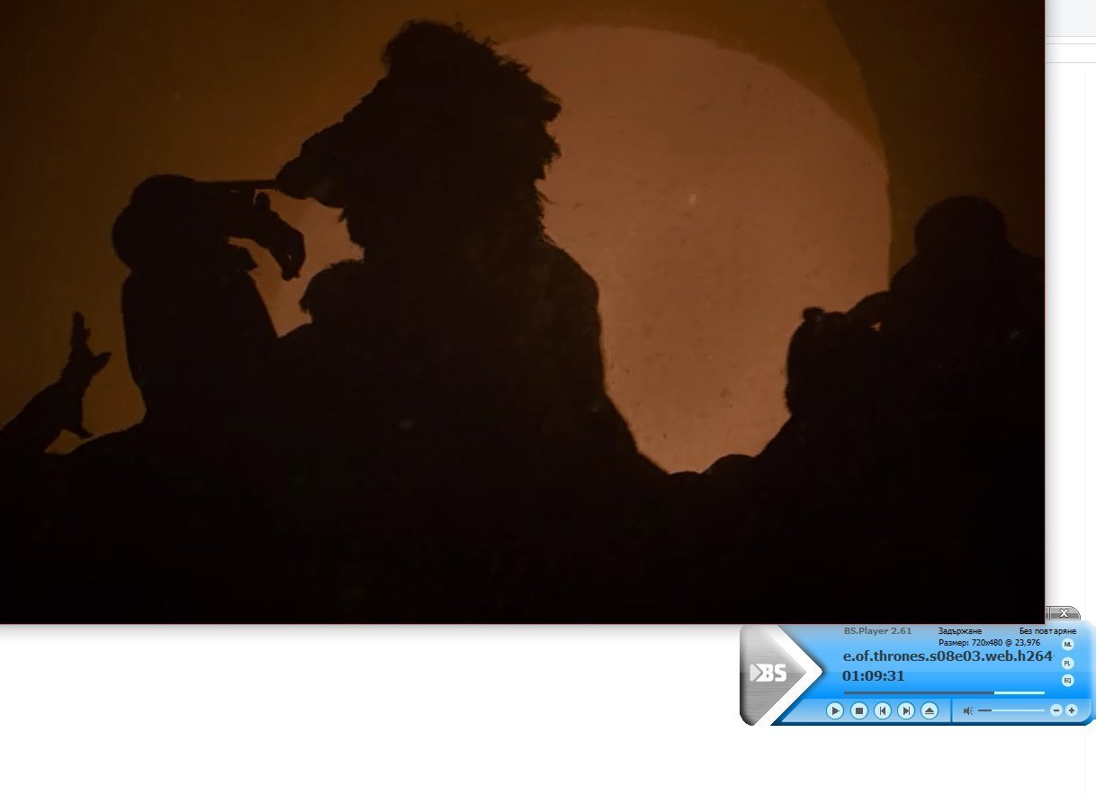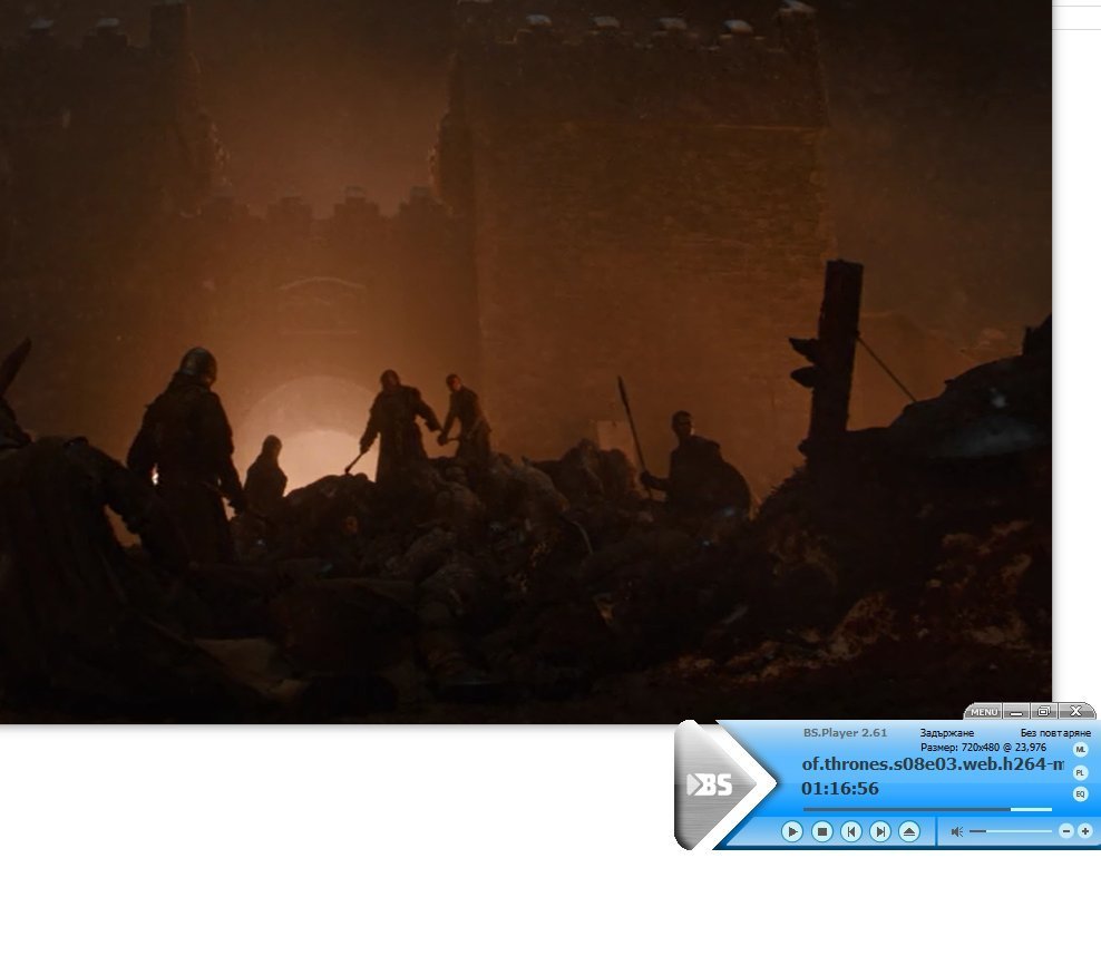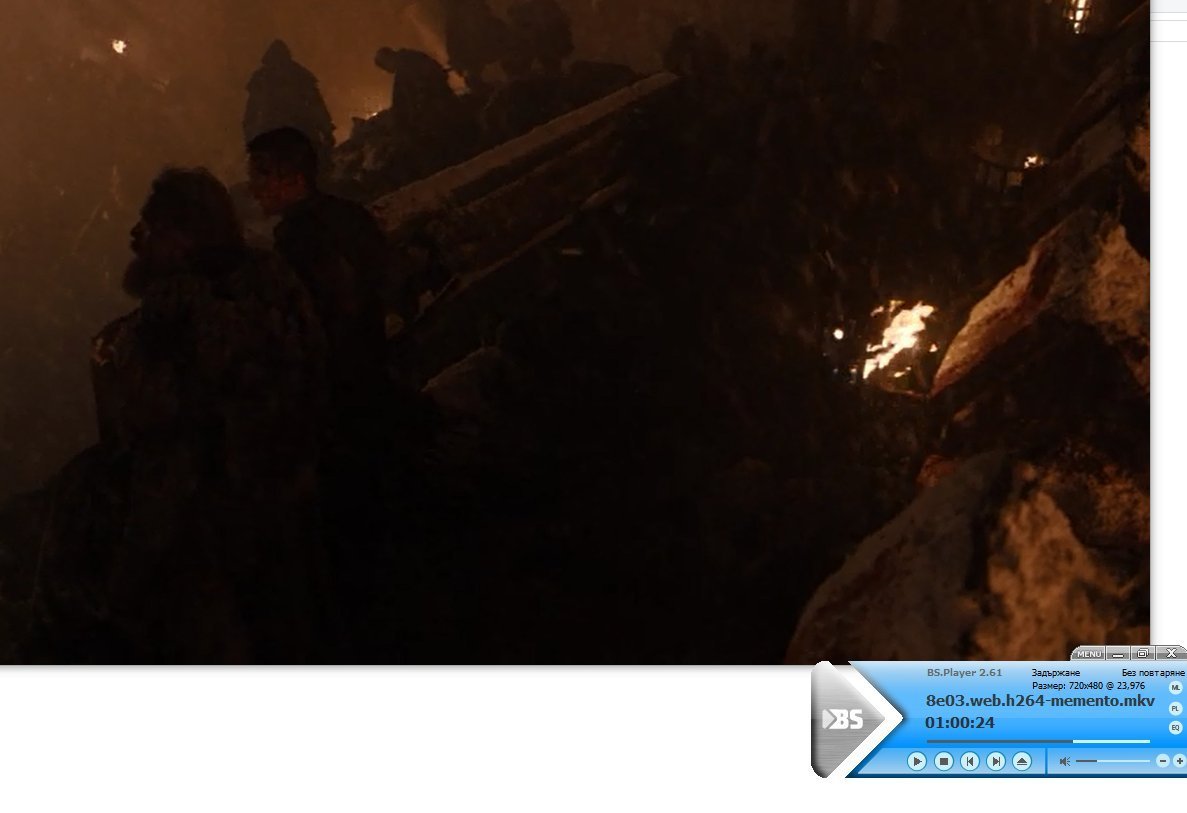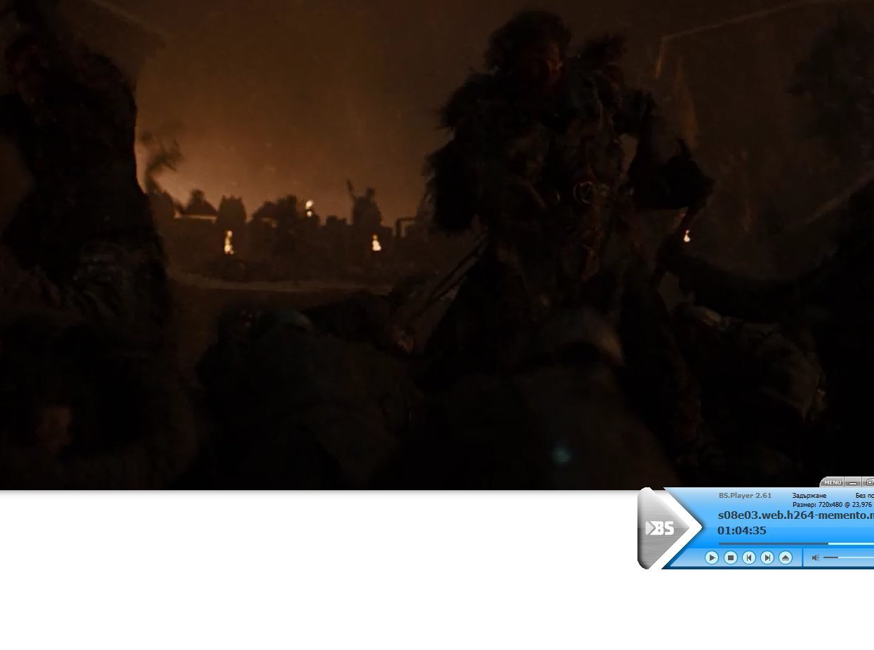 виждам че пада в някакво меле и някакъв я натиска отгоре и следващия кадър е с Джайм. Това е другиата ми критика - твърде забързани идват кадрите. Ако имахме ясна видимост, щеше да е добре, но при тази нулева видимост, нищо не се разбира. Единствените нормални кадри са на  Дани и Джон с драконите, които хвърчат над облаците, където е ясно небето , Санса и Тирион в криптите и статичните Бран и Теон.