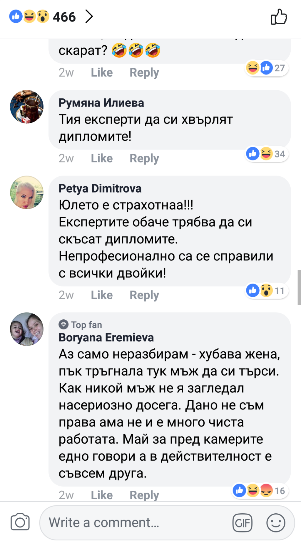 Аз нямам нищо против да критикувам участниците тук и на страницата на предаването, но се чудя що за идиот трябва да си, за да пишеш обиди на страницата на магазина? Дали систъра не е организирала нейните последователи?