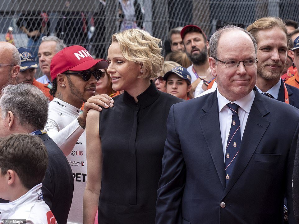 Принц Албърт, принцеса Шарлийн и Хамилтън на Гран При в Монако. Много фамилиарно си е сложил ръката на рамото и. Много ми е неприятен поначало. Голямо леке.