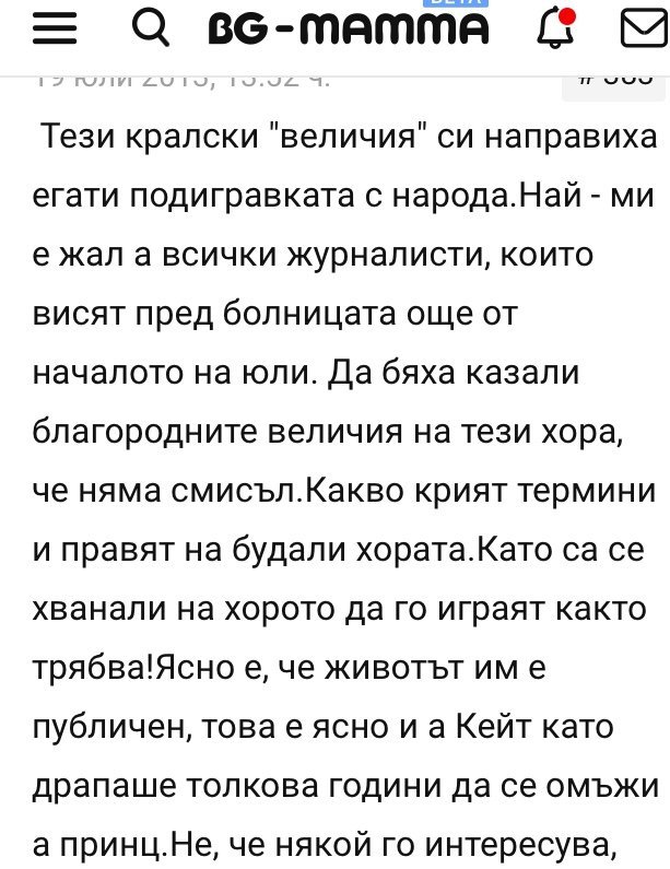 На мен винаги ми е било интересно, и за тиарите, и за дворците, и за историята. Обаче тук непрекъснато се прави тоя паралел и честно казано ми е досадно. Има хора, които живеят в Швеция, пускаха снимки от сватбите, от децата, харесвам Дания - Мери и Максима са ми любимки. Оня ден попаднах на една статия кои кралства имат най-скъпите бижута, обаче я загубих. Това ми е интересно, обаче тук има няколко човека, дето нон стоп сравняват ММ с Кейт или с останалите. Ми не ми е интересно, няколко пъти пускам снимки да отклоня посоката, ами и това не става. На мен ми е все тая за тая измислена дукеса, обаче има хора, които не искат да спрат.