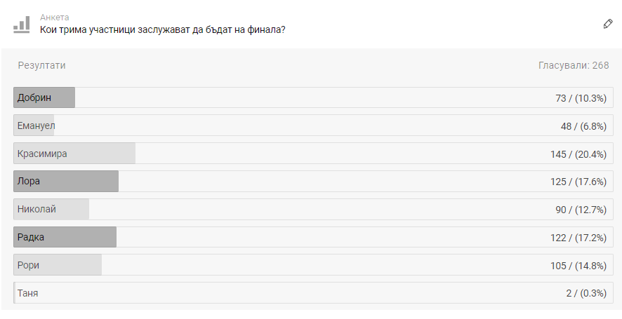 Не ми е мъчно вече за никого от напусналите. Та и за Емо не се натъжих. Тези, които се представяха за сладкари този сезон, нещо хич не ми бяха убедителни. Не ми е интересно и кой ще спечели. Може би на Добрин най-много ще се зарадвам, ама чак фен не съм му.