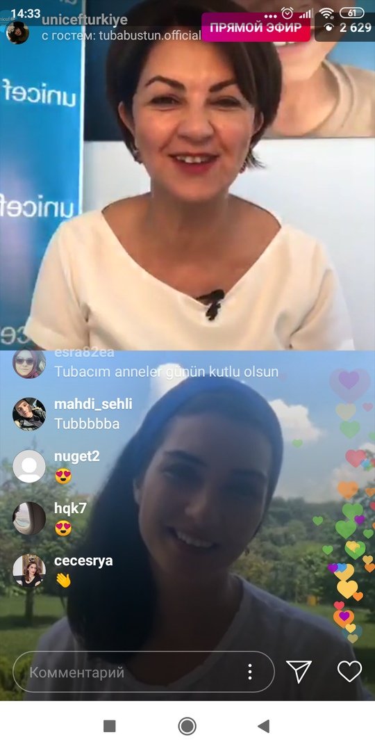 В: Сегодня у нас прекрасный и важный гость. Туба Бюйюкюстюн будет сегодня с нами Как вы знаете, Туба известна не только в Турции, но и любима во всем мире, она сделала очень много прекрасных дел. Она - деятель искусства, которой мы гордимся. У Тубы есть очень много особенных качеств, но одним из главных для нас является то, что она - посол ЮНИСЕФ в Турции и то, что она разделяет с детьми свою любовь и уважение. Еще одной особенностью Тубы является то, что она дитя своей матери и то, что она мама для Майи и Топрак. Готовы ли вы? Спустя пару секунд я приглашу Тубу в прямой эфир к нам. Процесс связи с ней может занять 20-30 секунд, а пока я вам расскажу кое-что. (рассказывает о новом проекте ЮНИСЕФ). Связавшись с Тубой, мы еще раз поздравим вас с днем матери и напомним, что быть матерью - это не только родить ребенка, а это и праздник тех мам, чьи сердца наполнены безусловной любовью и мы их поздравляем. И поздравляем тех мам, которые находятся в раю.. И мы приглашаем к нам Тубу. Вы готовы? А скажу еще кое-что. Присылайте свои вопросы Тубе на счет материнства и мы выберем 3 вопроса, на которые она ответит. Благодарю, мы связываемся, через пару секунд мы будем вместе..Здравствуй Туба! Добро пожаловать!