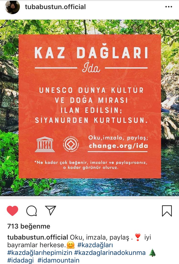 Туба се е присъединила към протеста на много хора на изкуството, против изсичането на планината Каз, заради проучвания за търсене на злато.