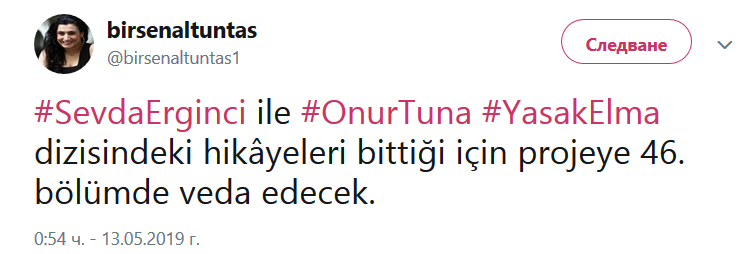 #SevdaErginci ile #OnurTuna #YasakElma dizisindeki hikâyeleri bittiği için projeye 46. bölümde veda edecek.