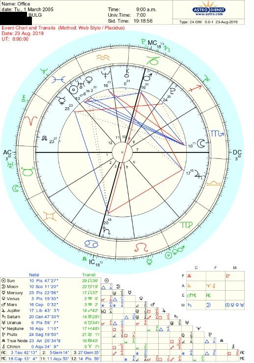 В момента Уран е в съвпад с асцендента, а Сатурн (управителят на 10ти дом) ще бъде в опозиция на наталния Сатурн догодина. Едновременно с това в 10ти дом ще се осъществи и съвпада на Сатурн и Плутон през 2020.
