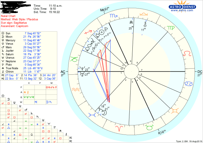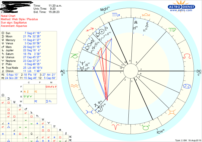 Родена съм на 30/11/1995г между 11 - 11,30ч. в гр. София.  Точно в този диапазон се сменят два Асцедента - този на Водолей и Козирог.