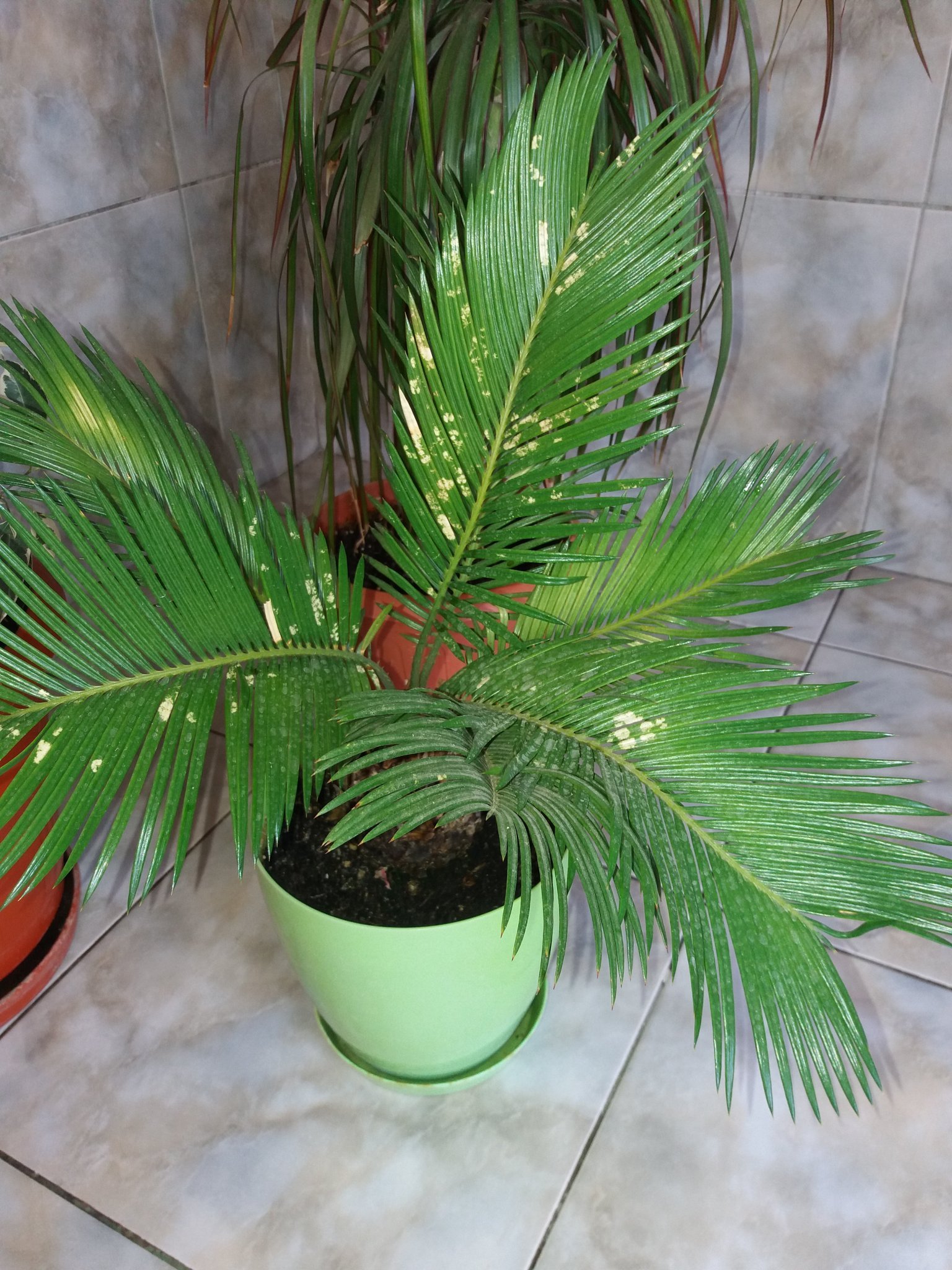 3. Тези бели петна по цикаса някаква болест ли са? Беше навън и налазен от  миризливки, които впрочем ми надупчиха листата на каланхоетата и мушкатите. Ще оцелее ли?