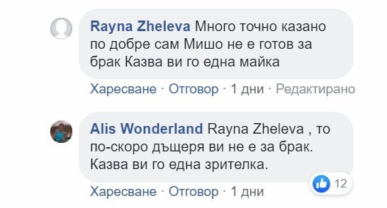 Между другото - вижте поведението на Мишо и Мерал - едни обикновени момчета, не са престарели, нямат кой знае какъв жизнен опит, не са от жълтите павета, обикновени млади мъже, че и с професии. Никога зад камера не си позволиха да злеподставят или дори да намекнат за някакъв проблем между тях и съпругите им. Сега че те самостоятелно си се изложиха, това е друг въпрос. Но кавалери, възпитани, добронамерени. И сравнете с Жълтьо - ТВ предавания, кандидат за депутат, познава този онзи, с претенции до небето. Обаче безпаричен, безпардонен, мързелив и ЗЛОБЕН подляр! Баш на Таня ли трябваше да натресат подобно чудо на природата?