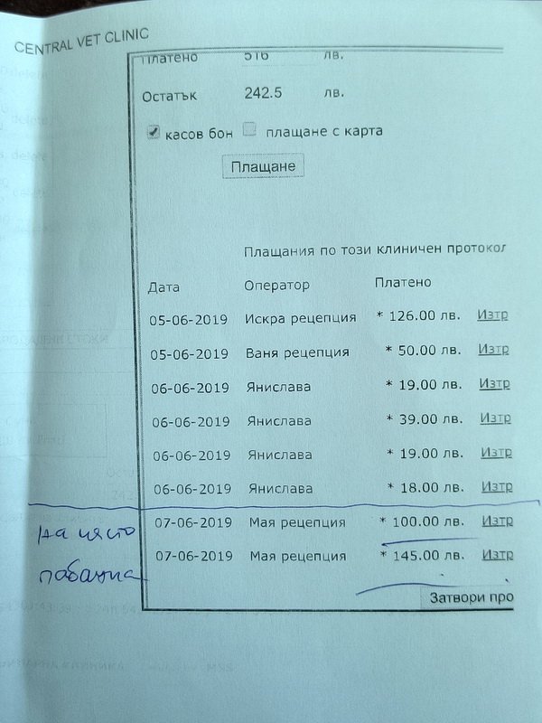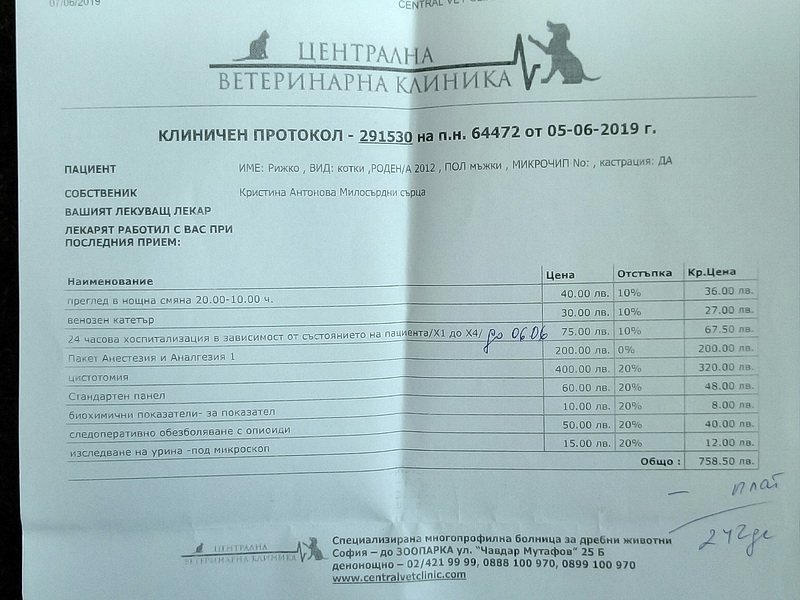 Сега се върнахме. Вече не е в реанимация. Ял е малко от ръката на доктора. От чинийка не иска, но може да е заради яката. Погалихме го, а той взе да тъпче с лапички. Според доктора, ако всичко върви добре, може след 2 дни да бъде изписан. Щели довечера или утре да махнат катетъра, за да видят дали може да пишка сам. За момента отделя достатъчно урина, която е добра на вид. Кръвни изследвания днес не са му правени. Утре ще видим как са показателите.