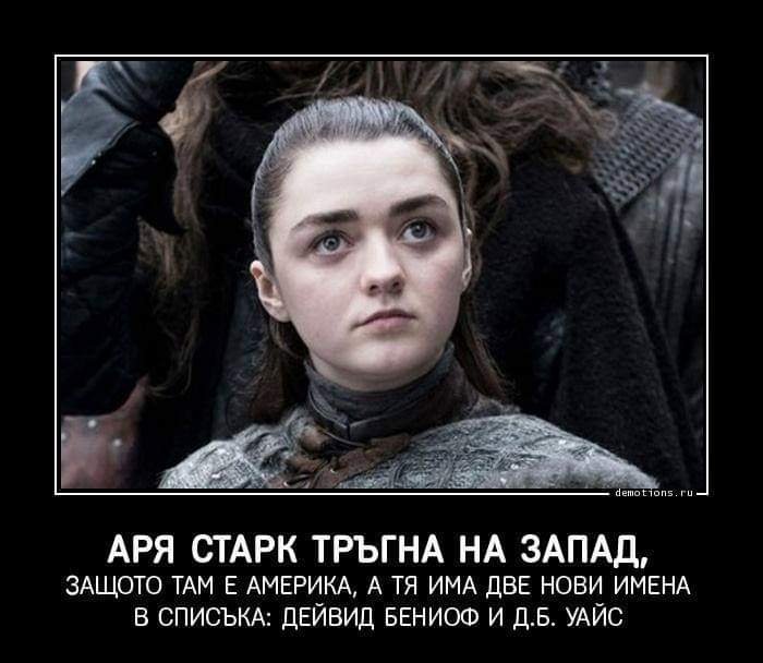 И съдбата на Джон беше зловеща. Несретник тръгна, несретник приключи, а толкова любов имаше в него. И съм ядосана, че уби Денерис. Не му отиваше това решение. Не му отиваше силата, с която го стори и после болката , с която попита Тирион дали е постъпил правилно.