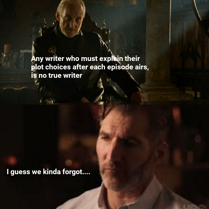 Deziderata, ето например за Бран. Значи в епизод 1 или епизод 2 можеха да дадат сцена в която Бран и Тирион се усамотяват. Може и кратка сцена. В някоя стая, Тирион влиза при Бран или се запътва към Язовото дърво, където Бран си кисне непрекъснато. Без да дадат нищо повече. Само някакъв лек намек. После ние тук щяхме да се чудим тия за какво са си говорили и защо не са ни показали. Но над 80% от феновете шяха да го забравят този момент. Но сега на финала щеше да има някаква тежест предвид как ей така от нищото Тирион го изваждат от плен няколко седмици, мръсен, подпухнал и той дава гениалното предложение за Бран несломимия. И поне в един/два момента Бран да бе направил нещо или разкрил нещо, за да има повече тежест. Не че това ще спаси изцяло положението, но все е нещо.