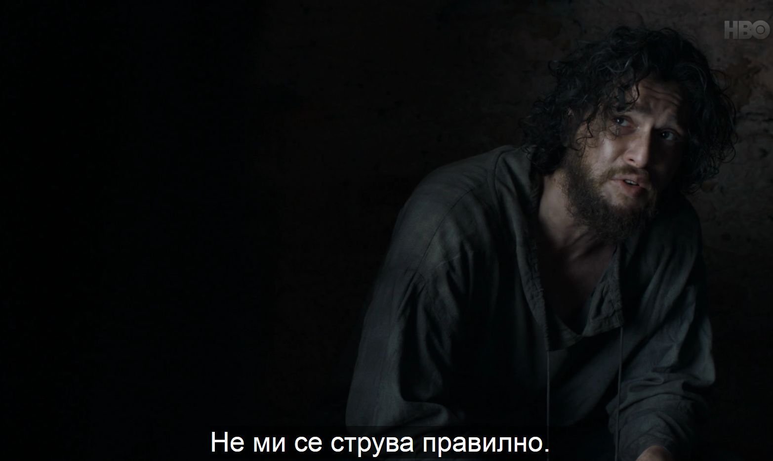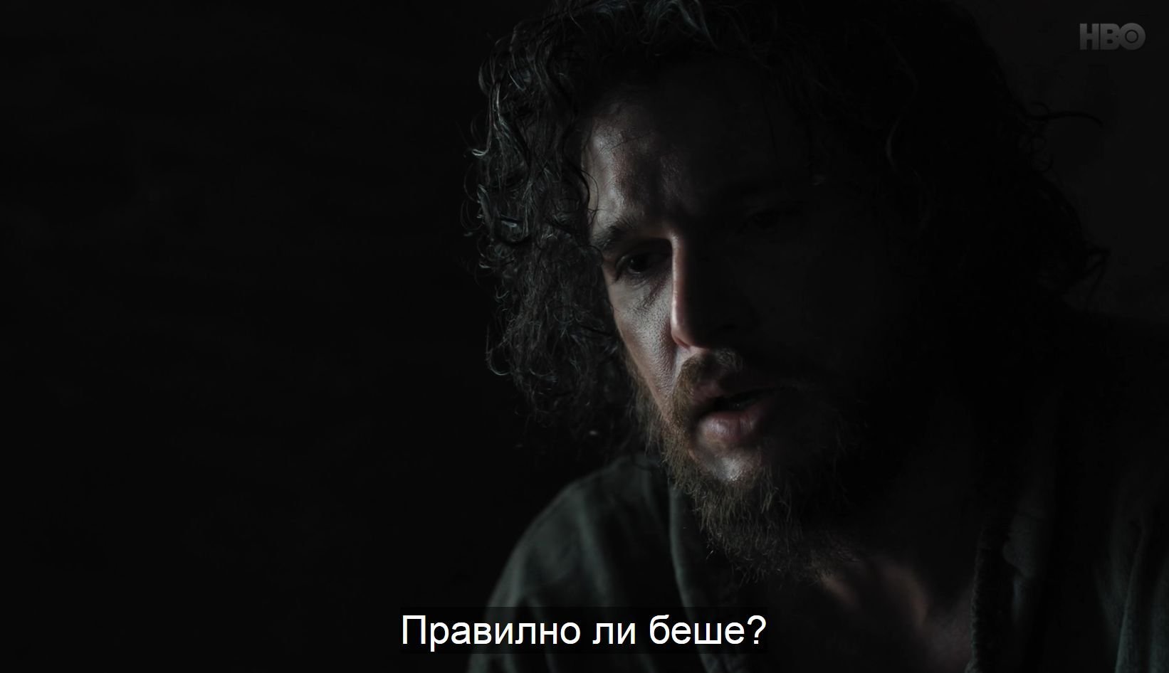 Всички моменти, които трябваше да са най- драматични и да има най много съспенс, бяха орязани. Трябваше малко в по- големи детайли да видим последствията от действията на кралицата, очаквах, че когато Джон види Аря ще се ядоса, че Денерис я е изложила на опасност, очаквах да видим как армията на Денерис разбира, че е убита и как залавят Джон. Сблъсък между северняците и неопетнените. Оттам Давос можеше да се намеси да ги успокои. Той го игра статист малко тоя сезон. Оттам реакцията на Санса, Аря и Бран като разберат, че Джон е в плен, а не всички да се оставят да ги разиграва Сив червей. Скандали, сблъсъци, истини... Това трябваше да има в епизода. Аз не мога да повярвям, чв все пак мекотелото Джон я е ибичал тая пироманка. Кви бяха тия вътрешни терзания. Че той ексекотира момче на Вала без да му мигне окото, уби свой, за да не развали прикритието си, а сега цял епизод се терзаеше дали е постъпил правилно.