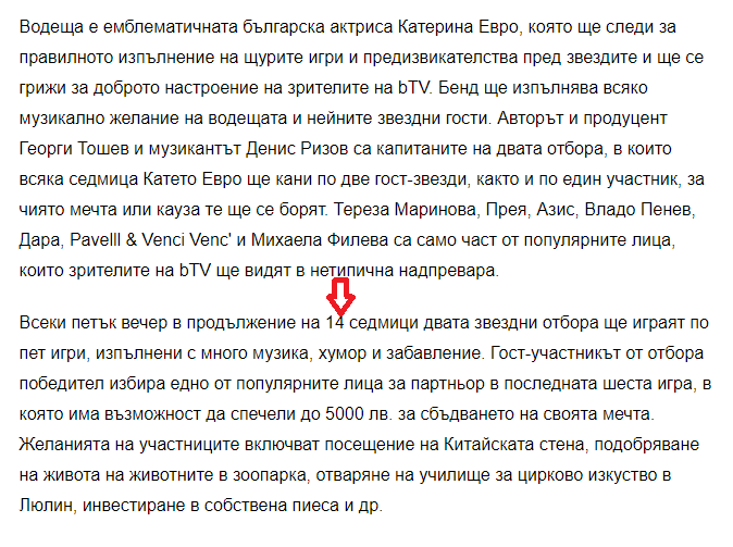 Твърде комерсиално. Познати игри от други предавания. Участниците завалиите къде другаде да се изявят, за да не бъдат забравени. Имах Георги Тошев за доста по-извисен културно, но пари не са излишни никому.