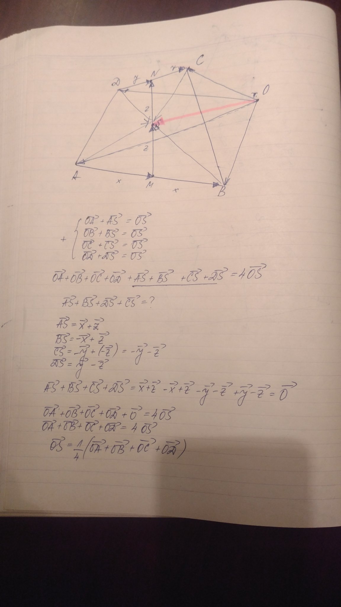 OS=(OM+ON)/2=((OA+OB)/2 + (OC+OD)/2)/2=(OA+OB+OC+OD)/4