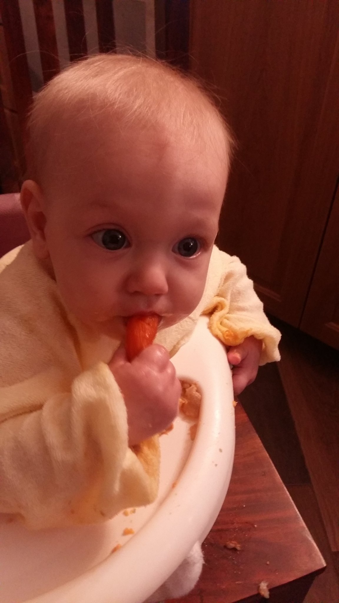 Само като го оставя в кошарата казва отчетливо мама. Иначе някой път като е в настроение да яде и види пълен буркан казва ам-ам.