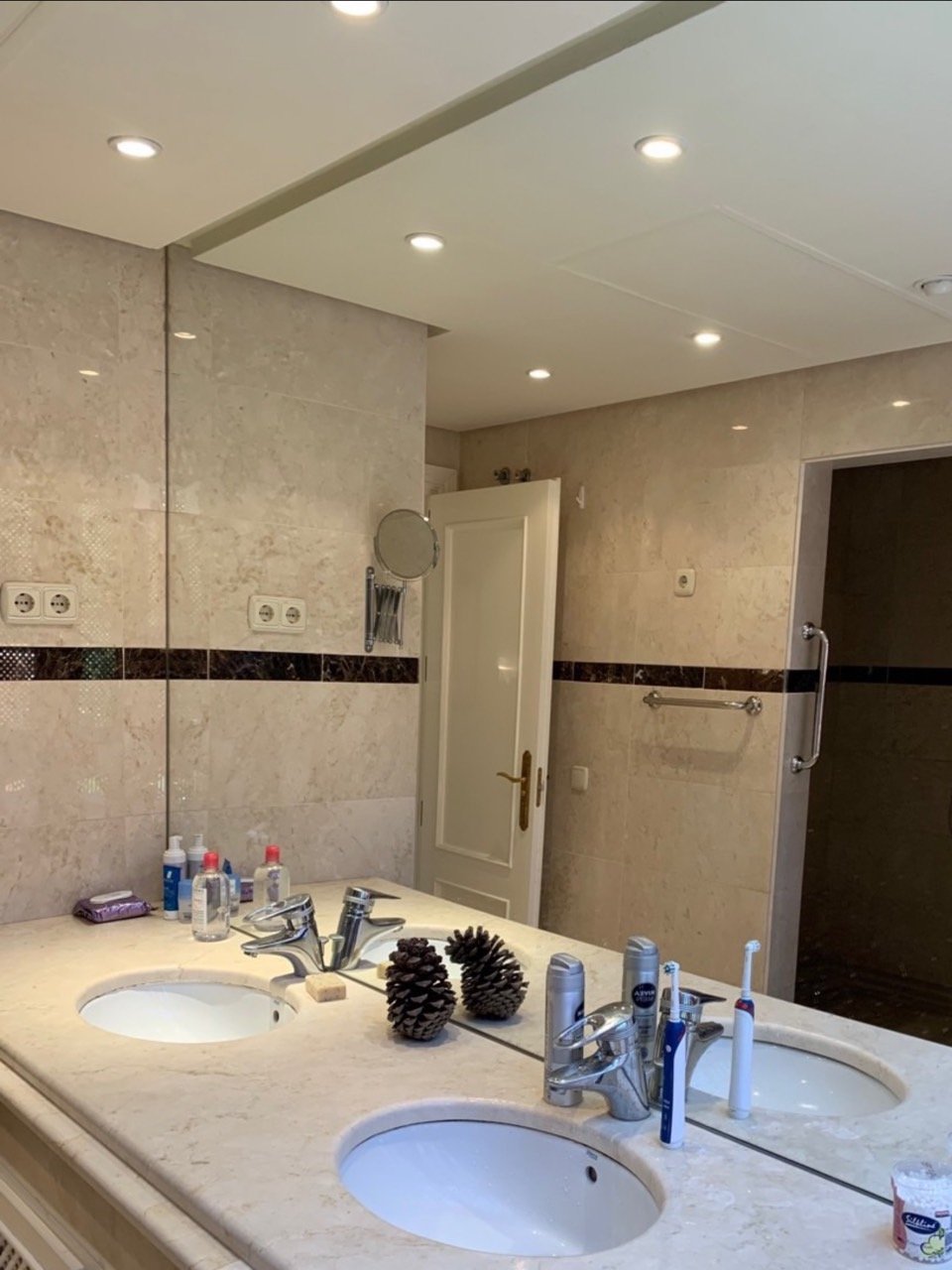 Банята е правена преди 24 години в зората на плочките различни от 20х20 бели или сини квадратни Grinning с материали издирвани по чужбина и у нас. За годините си изглеждаше много прилично. Нямам си идея как точно е слагано огледалото по онова далечно време. Факта си е факт, огледалото винаги е опръскано в долните 20-тина см. и ако е варовита водата както при нас и не избършеш веднага капките си остава варовик по огледалото. После този варовик като трябва да се напръска с Цилит или подобни нему с годините прониква малко по малко под огледалото и става това, за което споменах.