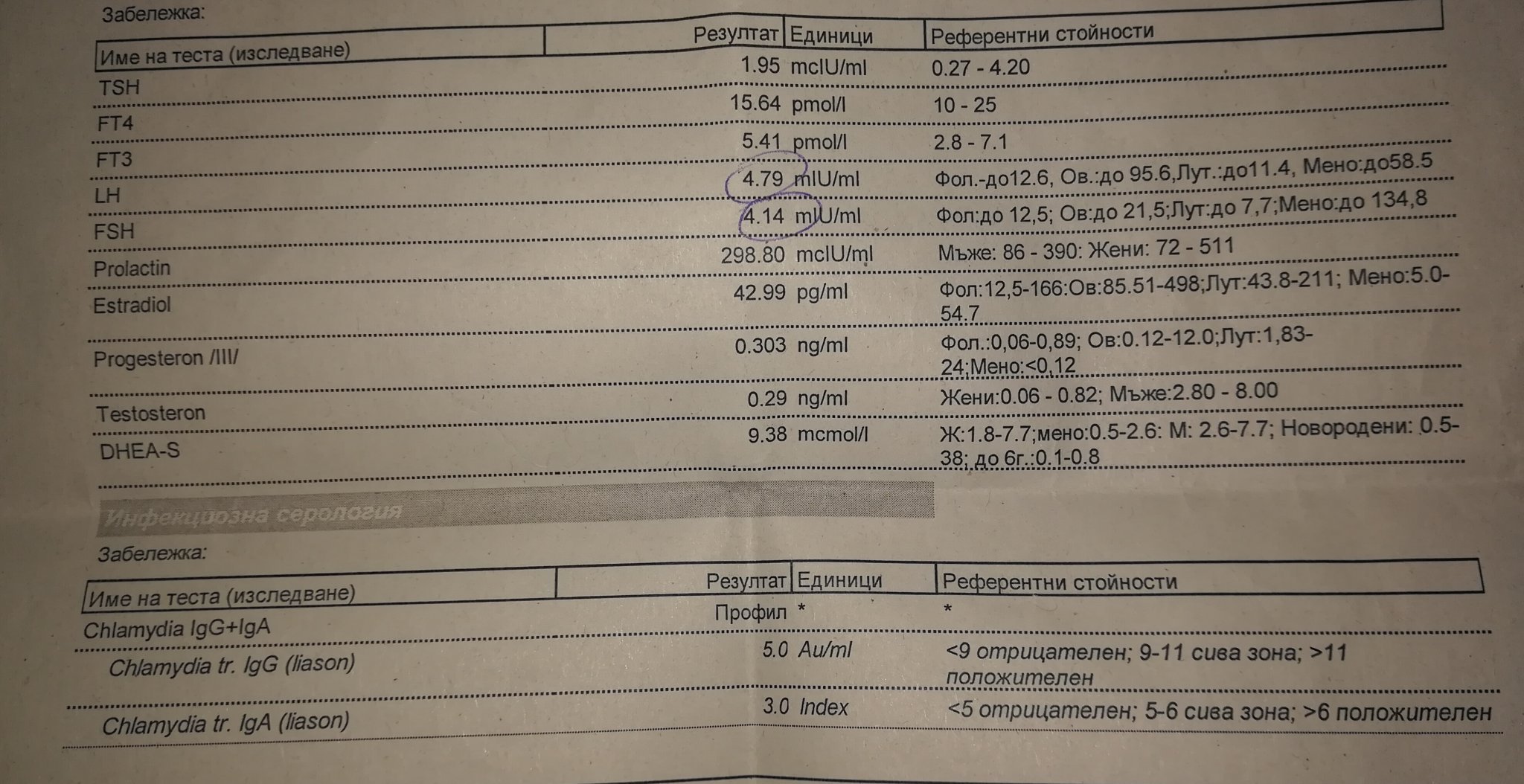 правим опити с мъжът ми за бебе, но не се получават нещата, направихме всички изследвания, като сме с неизяснен стерилитет. На 26 години сме и двамата. Можеш ли да ми дадеш мнение на хормоналните ми резултати? Според специалистта който посещаваме имам ПКЯ на база тези резултати и нередовния ми цикъл,но на ехографа не се виждат никакви кисти.Посетихме и андролог-репродуктивен специалист който  прегледа освен изследванията на мъжът ми и моите, и според него тези резултати не показват поликистоза и чак се учуди на това което са ми казали. Изследванията за правени на 3ти ден от цикъла.