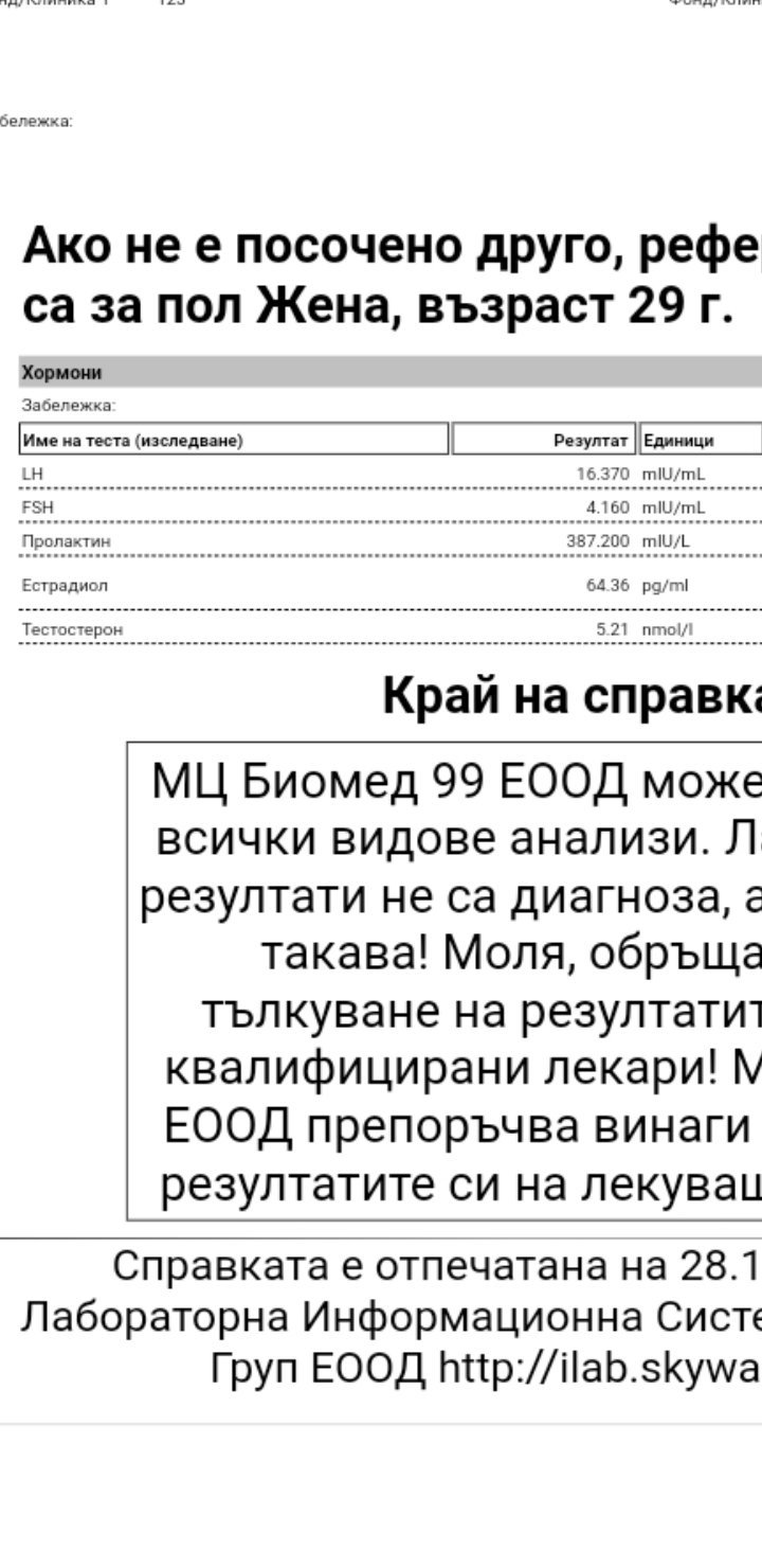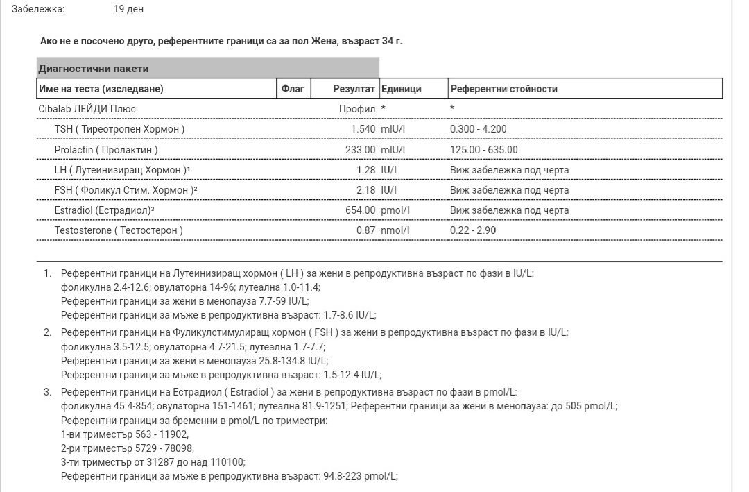 Резултатите от изследванията на полови хормони предоставят информация за различни хормонални дисбаланси и проблеми, свързани със зачеването. Например, ниските нива на прогестерона могат да доведат до нередовен цикъл и трудности при зачеване. Високите нива на тестостерона могат да причинят акне и други проблеми. Тези резултати могат да насочат към необходимостта от допълнителни изследвания и консултации с ендокринолог. Резултатите от хормоналните изследвания предоставят информация за нивата на различни хормони, като TSH, Prolactin, LH, FSH, Estrogen и Testosterone. Те се използват за оценка на репродуктивната функция и могат да покажат проблеми с яйчниците, щитовидната жлеза функция, възможни проблеми с бременността и други здравословни състояния. Резултатите от изследване на полови хормони предоставят важна информация за репродуктивното здраве. Например, високите нива на LH и FSH могат да показват проблеми с яйчниците или овулацията. Високите нива на естрадиол (Estrogen) и прогестерон (Progesteron) могат да показват здравословна овулация, докато високите нива на пролактин и TSH могат да повлияят на репродуктивната функция. Препоръчително е да се консултирате със специалист, като гинеколог или ендокринолог, за тълкуване на резултатите и определяне на подходящото лечение.