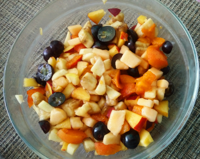 Торт, която той направи за колегите си с бишкотен блат, плодове, бита сметана, цедено мляко и Нутела
