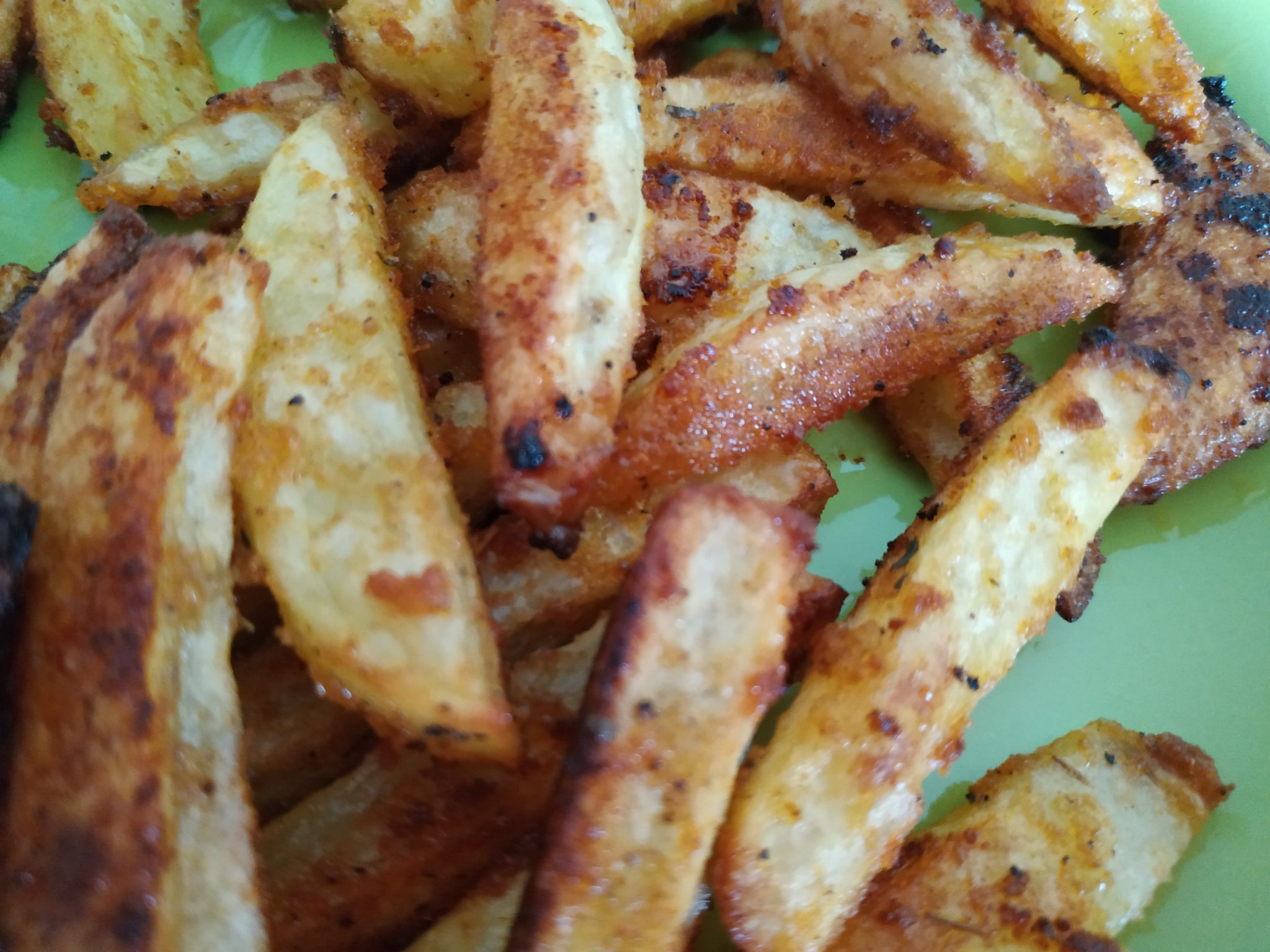 Следобеда ми се приядоха картофи по селски, от онези дето продават замразени, но понеже избягваме да купуваме овкусени храни, се наложи да импровизирам. Та, сложих черен и червен пипер, сол, чесън на гранули, малко мащерка, галета и олио. Пекох 20 минути и мога да кажа, че бяха страхотни. Единственият минус беше, че трябваше да си отпусна още един картоф, за да се наситя Joy