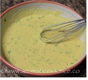 1.Загрявате мазнината и последователно добавяте в нея хинг-а , кимионовите зърна и зелената люта чушка. Мазнината трябва да е достатъчно добре загрята, за да може кимионът да се разпука звучно и след това да усетите силен аромат.