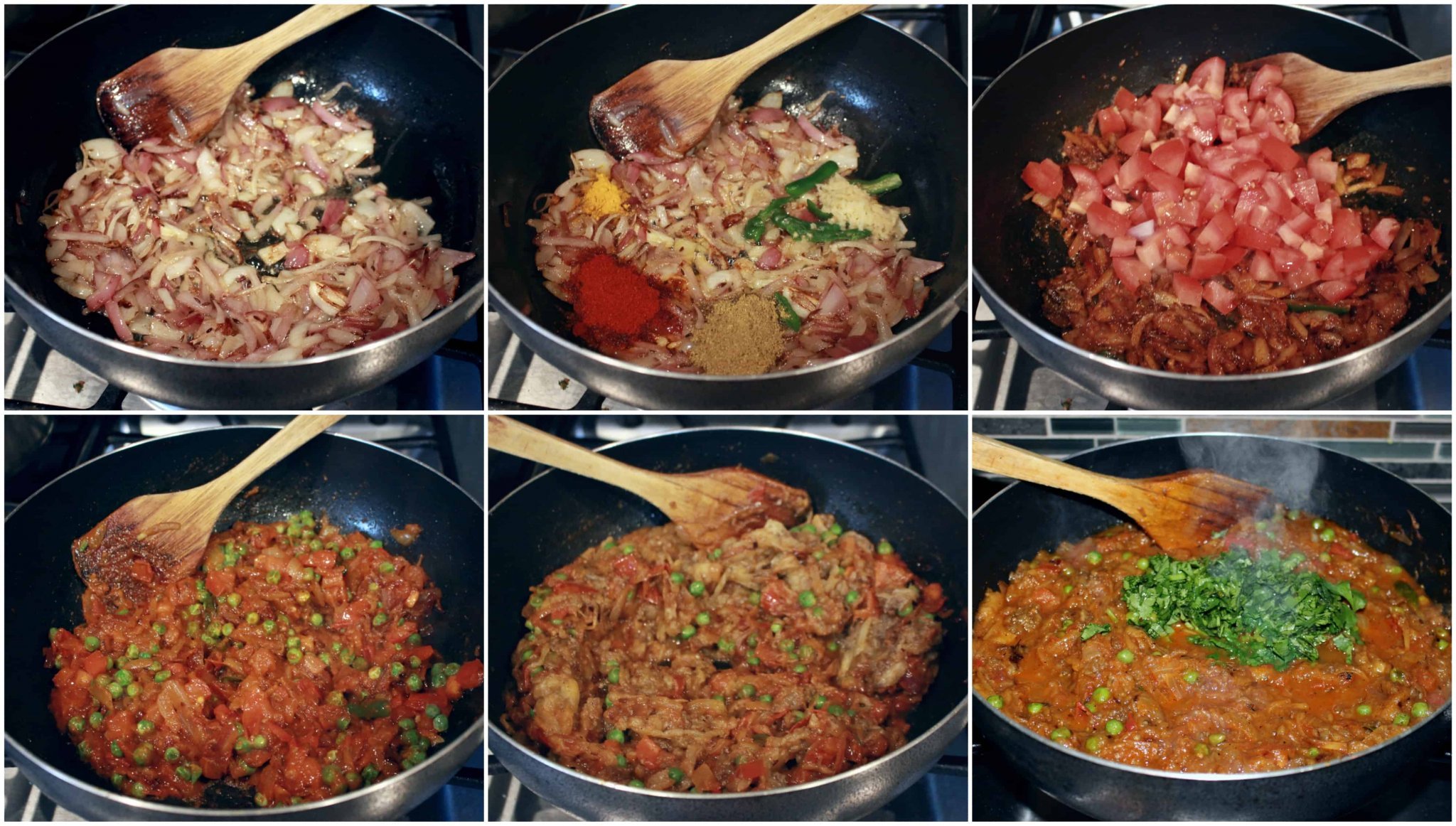 2. Ако добавяте лук и джинджифил - ги поставяте веднага, след като кимионът започне да променя цвета си, и разбърквате.  Оставяте лукът да се запържи добре, след което добавяте доматите и пак бъркате. (Ако готвите без тях, продължавате с другите подправки)