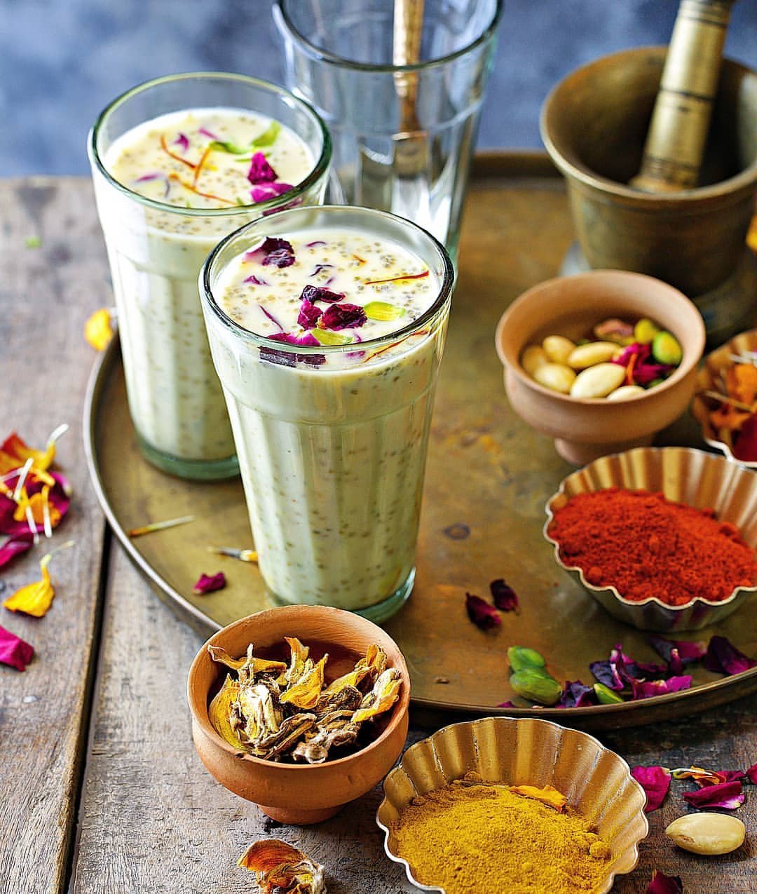 Любимо мое питие. Рецептата е за фестивала Холи на един от най-добрите готвачи в Индия ( ако не друго, може да почерпите идеи ). Лично аз използвам розов сироп вместо сушени цветове от рози и слагам вместо захар мед. Обичам го с повечко кардамон.