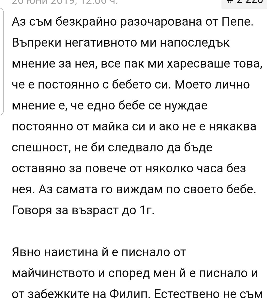 Няма проблем, че ги дава на ясла и на баби и прабаби. Повечето родители постъпват така, никой не ги упреква. Проблем е, че Пепе набива канчето на зрителките си как е супер лесно гледането на дете, да го взимаш на работа (имаше и такива откровения), как ако искаш - намираш начин да си с децата си постоянно. Призоваваше младите момичета да раждат рано, без значение дали са с образование и стабилна работа. Тия неща не били важни, нещата се нареждали.