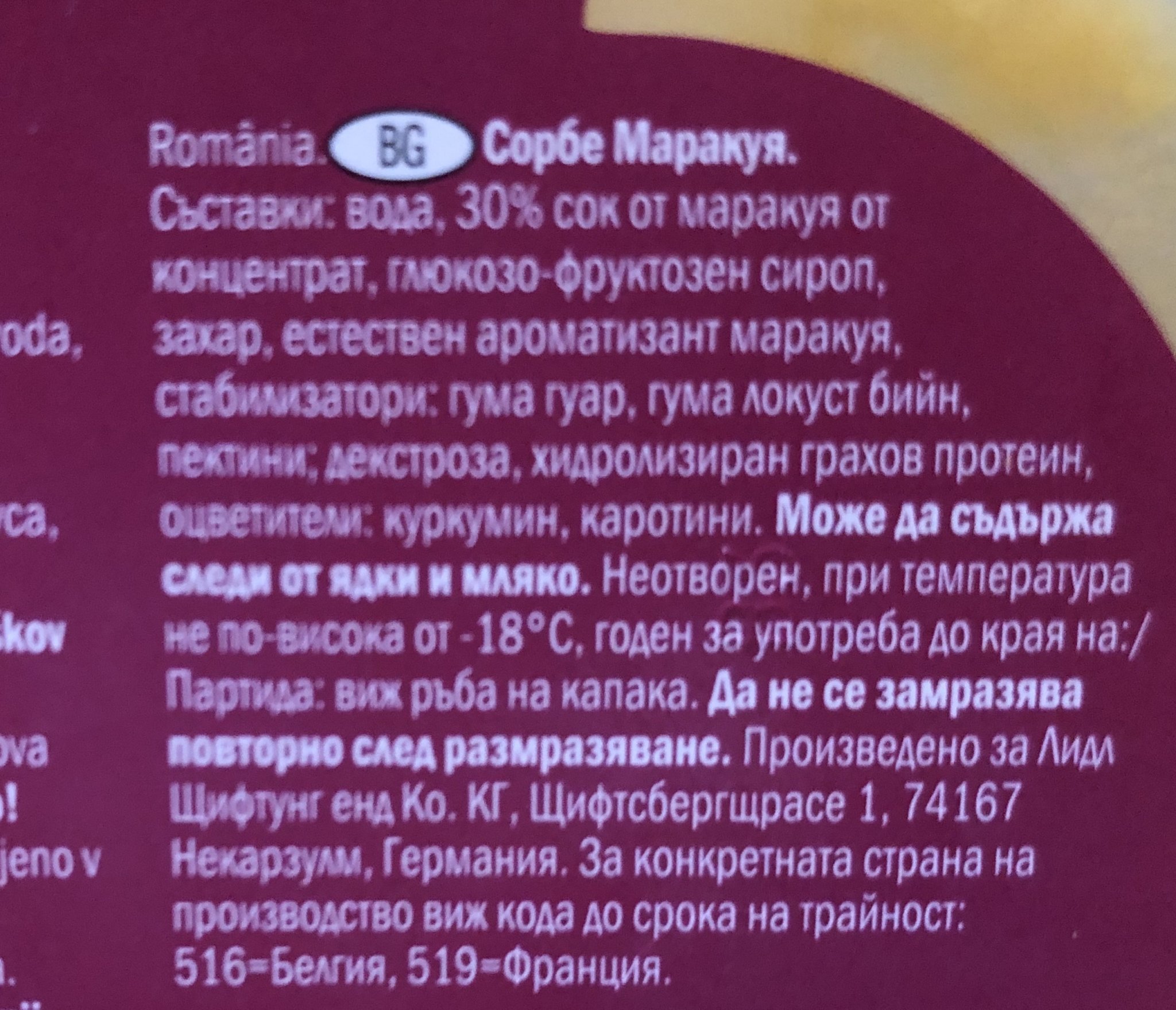 Сорбето е без яйца. С грахов протеин . Ето състав на маракуята от Лидл. Може да има следи от ядки и мляко, но това го пишат за презастраховане обикновено на всички подобни продукти.