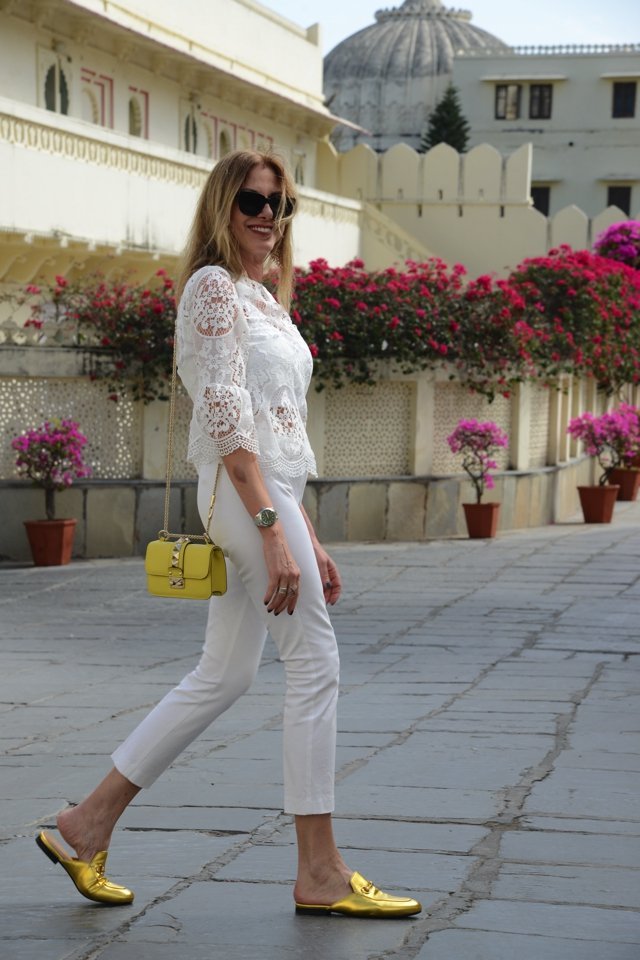 Какви са коментарите относно съчетаването на червени сандали, тъмносин панталон и риза в цвят лайм?