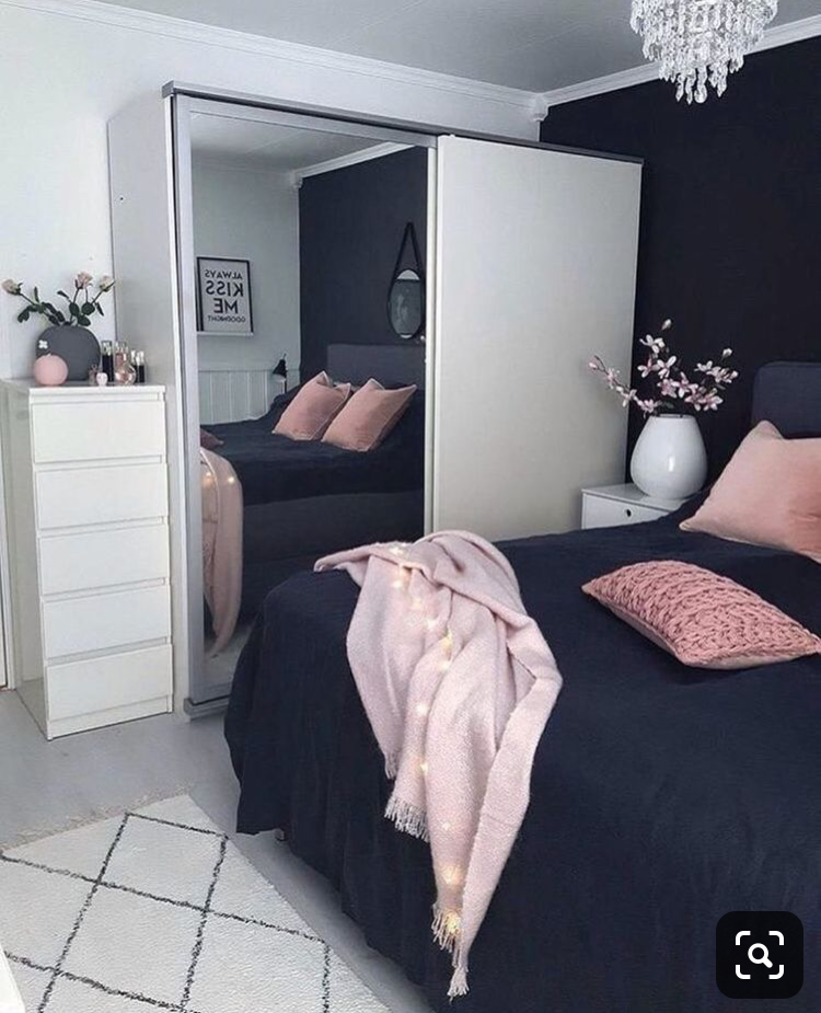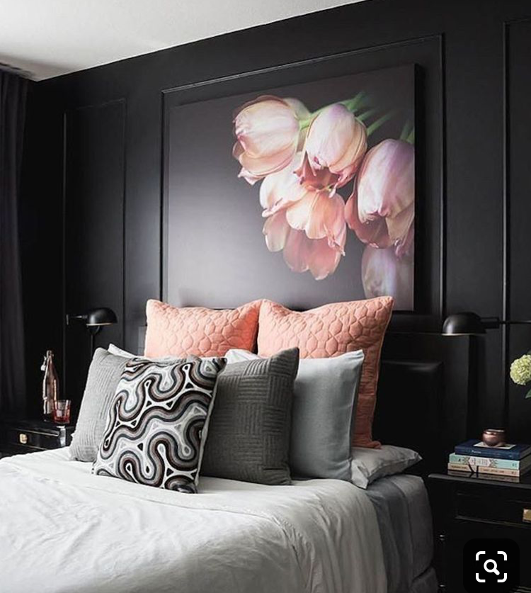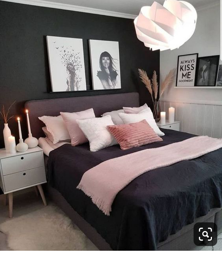 . Цветовете са черно, бяло, и на стените има облицовка в светло бежово. Завеси мисля в бяло. Пудреното и на мен ми се върти в главата - може би за шалте, и килим ...