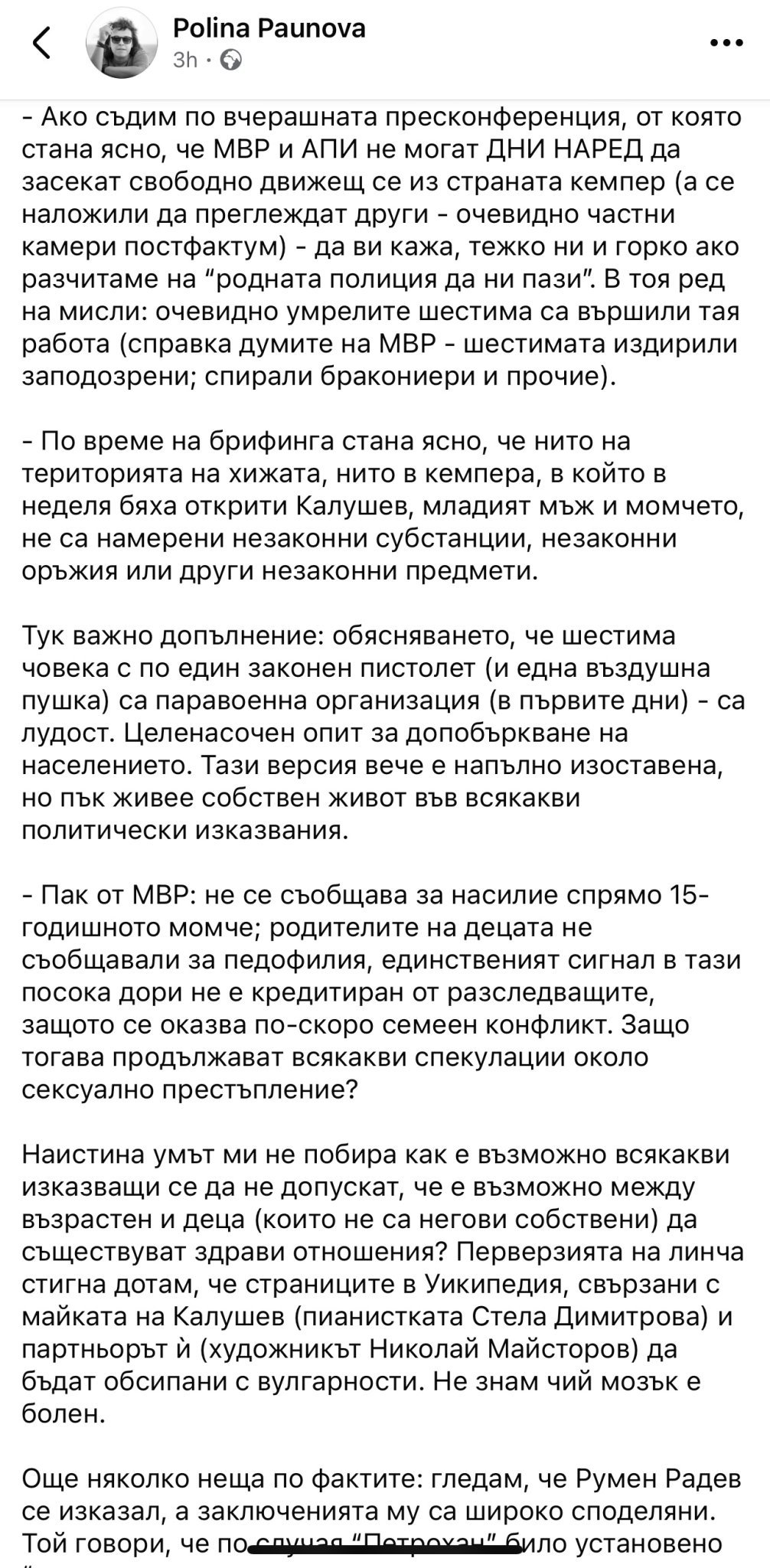 Не е лошо да се прави разлика м/у факти и това 'една жена ми каза'. Хората, които визираш, има предостатъчно факти с какво са се занимавали и какво са правили. В този случай имаме тези, които ги познават (включително и родителите), които казват, че са страхотни хора и педофилските обвинения и какви ли не идват от Сарафов, Деньо Денев, някакви придворни "анализатори" на Пеевски и хора, които никога не са ги чували преди този случай. Единствената база за тези обвинения е, че са имали чужди деца около себе си. Това, разбира се е странно, но може лесно да бъде обяснено с помощ, алтруизъм и т.н. Това е все едно да обвиняваме осиновители на деца като педофили.