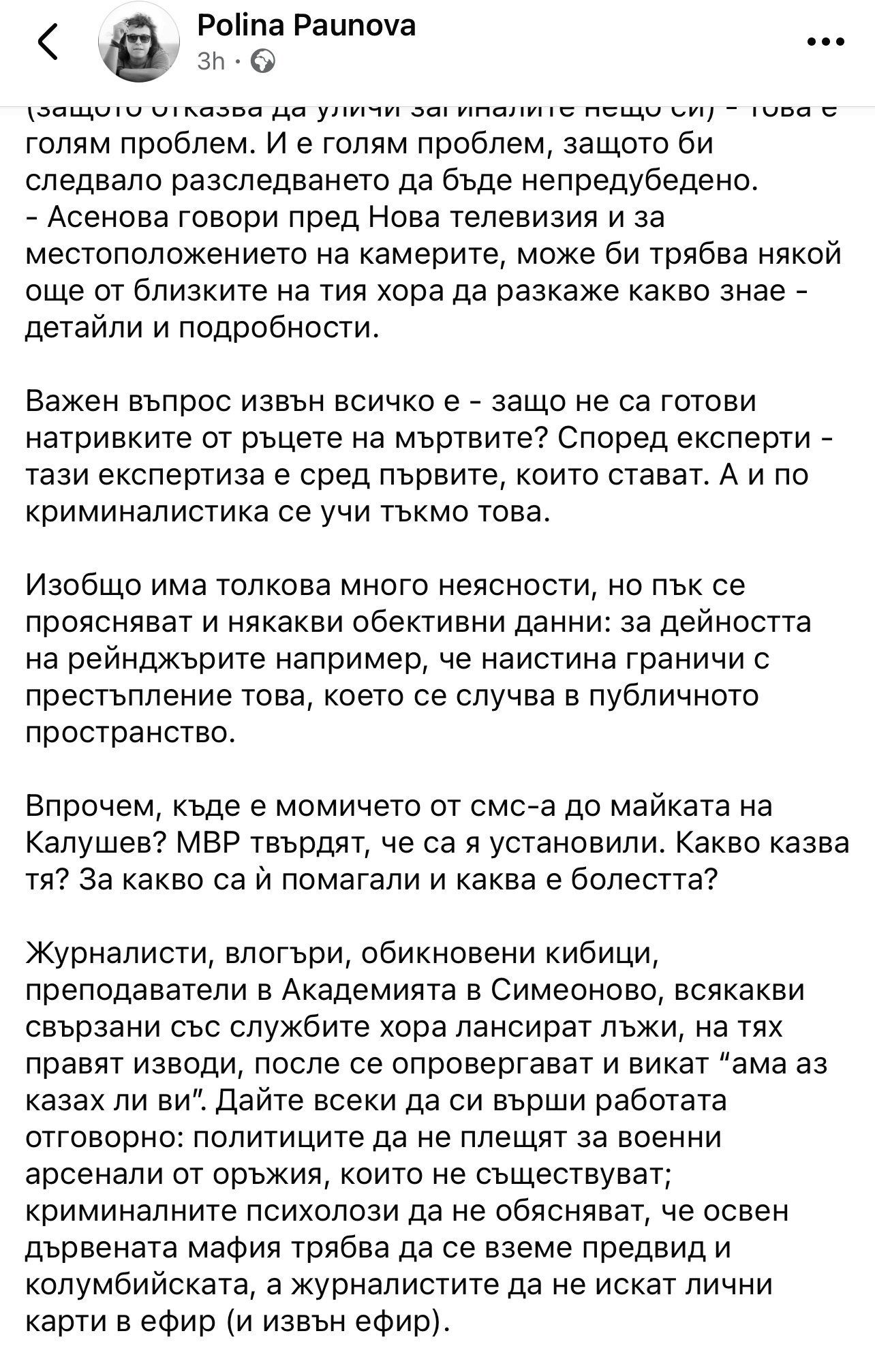 Според мен разследващите са изгледали всичко на камерата още в първите часове и знаат какво има записано, за да излиза и Сарафов да се" потриса". Но докато не се изготвят техническите експертизи, няма да ги предоставят. Тези записи, които официално получихме, предидвикаха такава лавина от спекулации, че сигурно вече съжаляват .